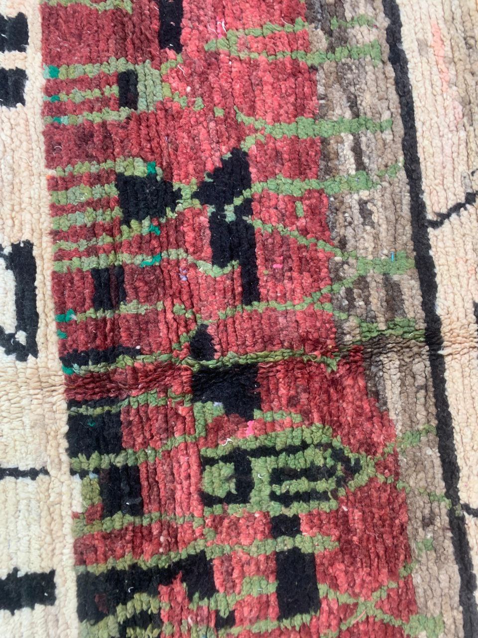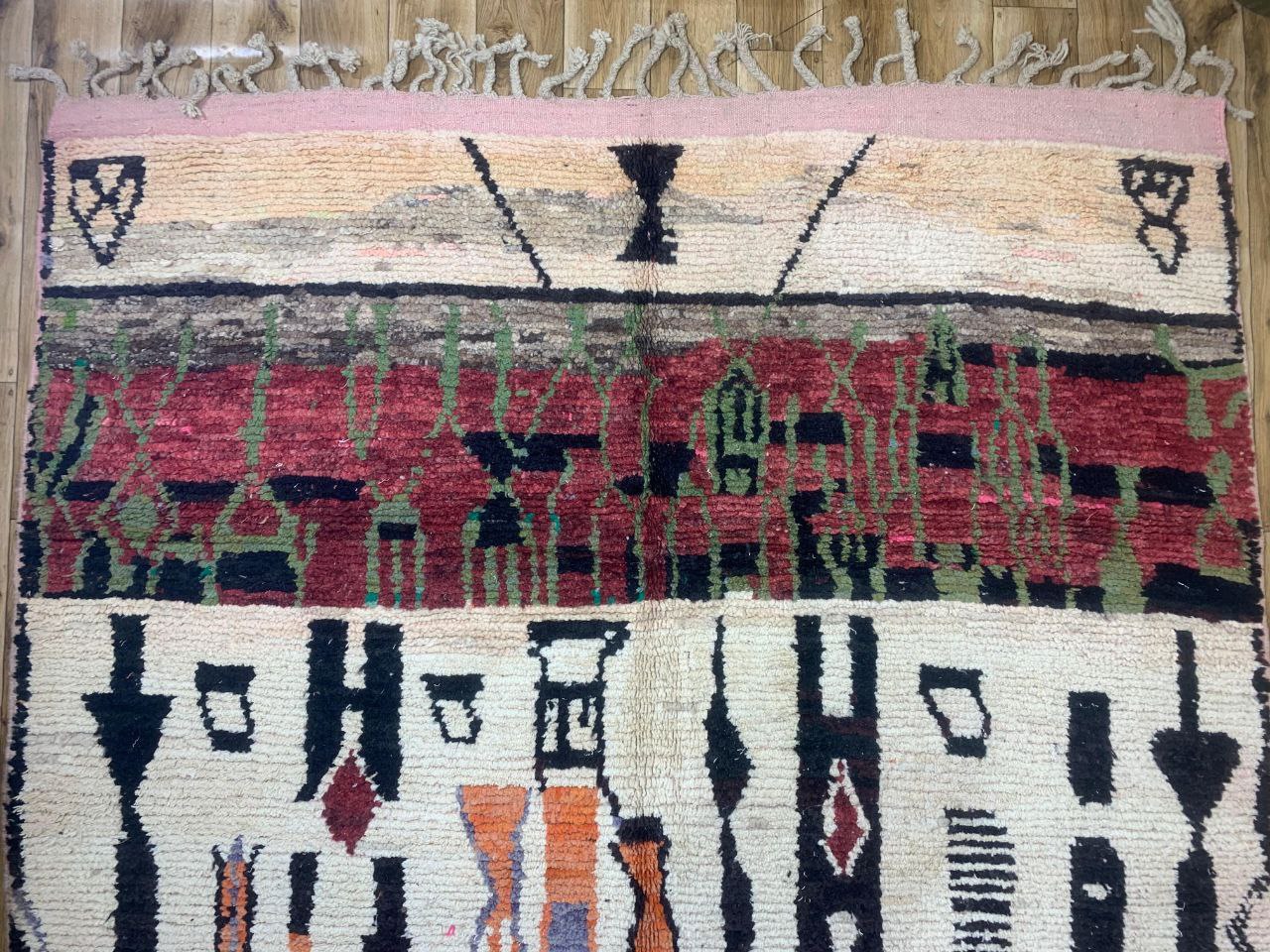 Handwoven abstract rug featuring bold geometric motifs and a richly textured pile. The design combines an ivory base with a blush pink top band, a deep red central panel, and contrasting black symbols accented by green and warm orange details.