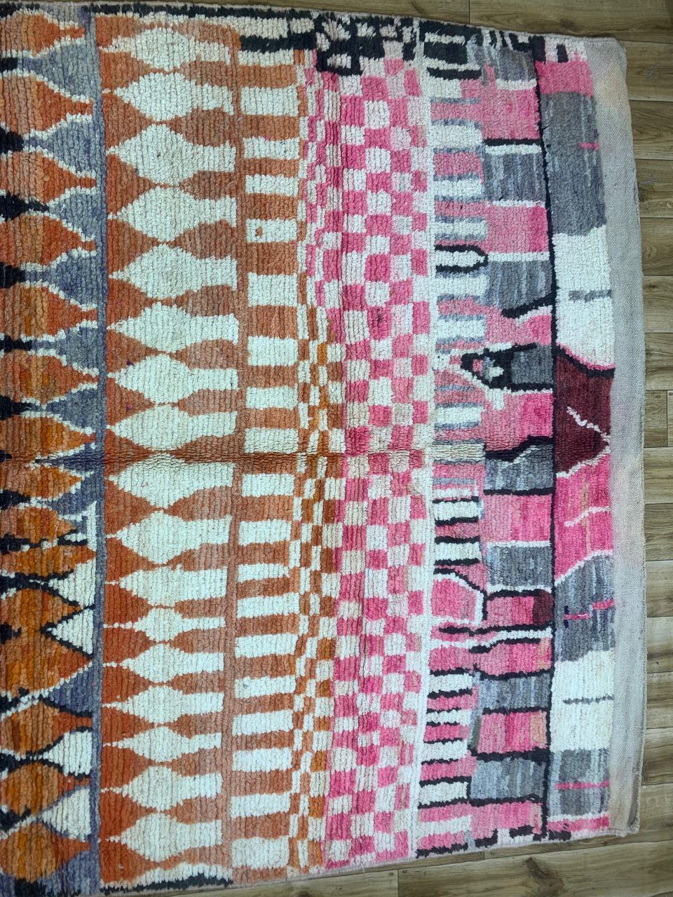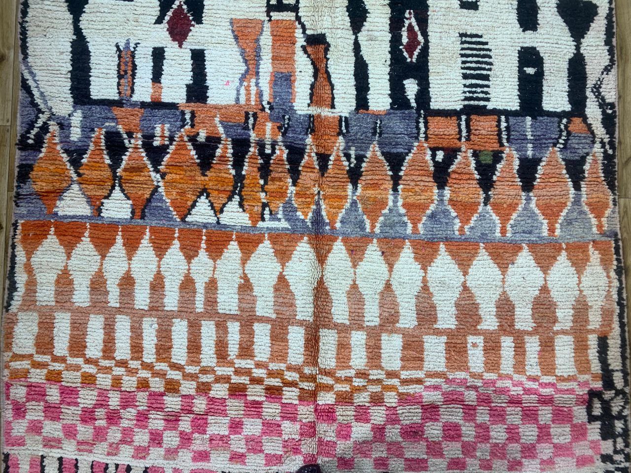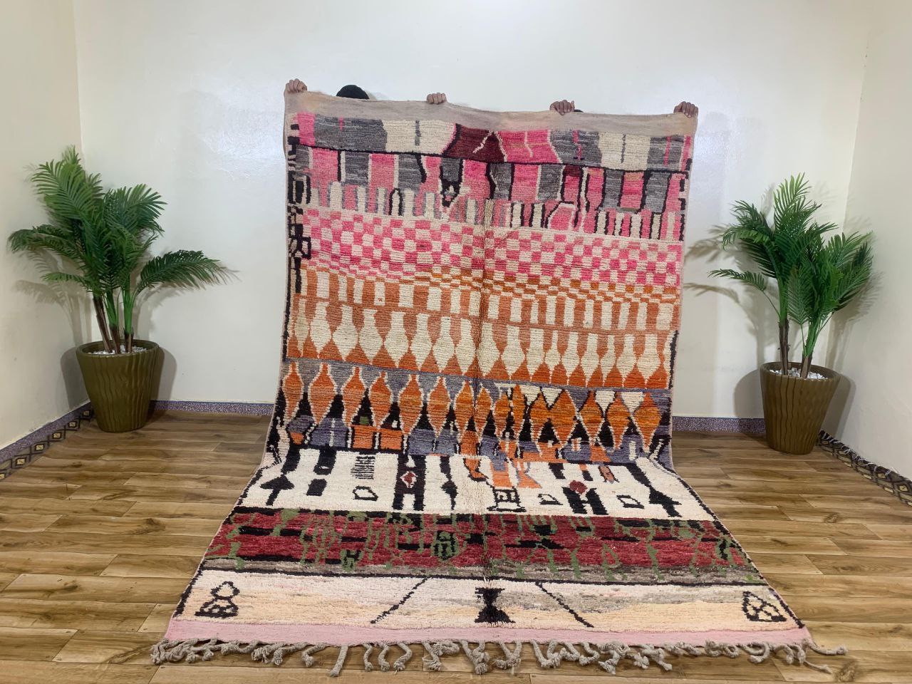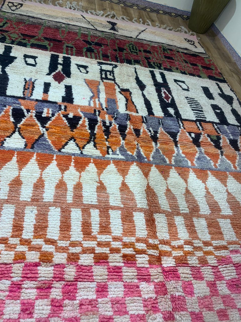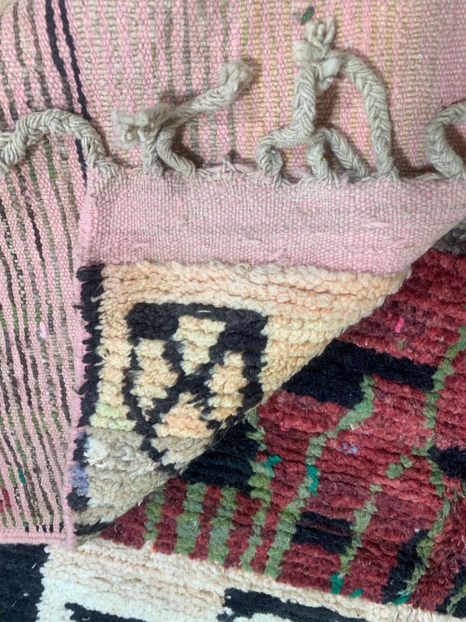 Textured handwoven rug with abstract geometric motifs, an ivory base, bold red center, blush accents, and fringe detailing—perfect for adding warmth and artistic character to any space.