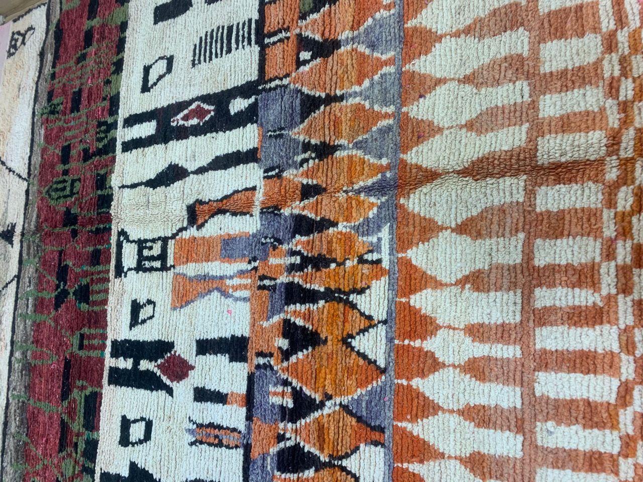 The rug showcases a tactile, knotted construction with visible artisan character and traditional fringe edging along one side, adding a relaxed, bohemian finish. The irregular motifs and earthy palette give it a unique, one-of-a-kind look that works beautifully in eclectic, modern, or boho-inspired interiors.