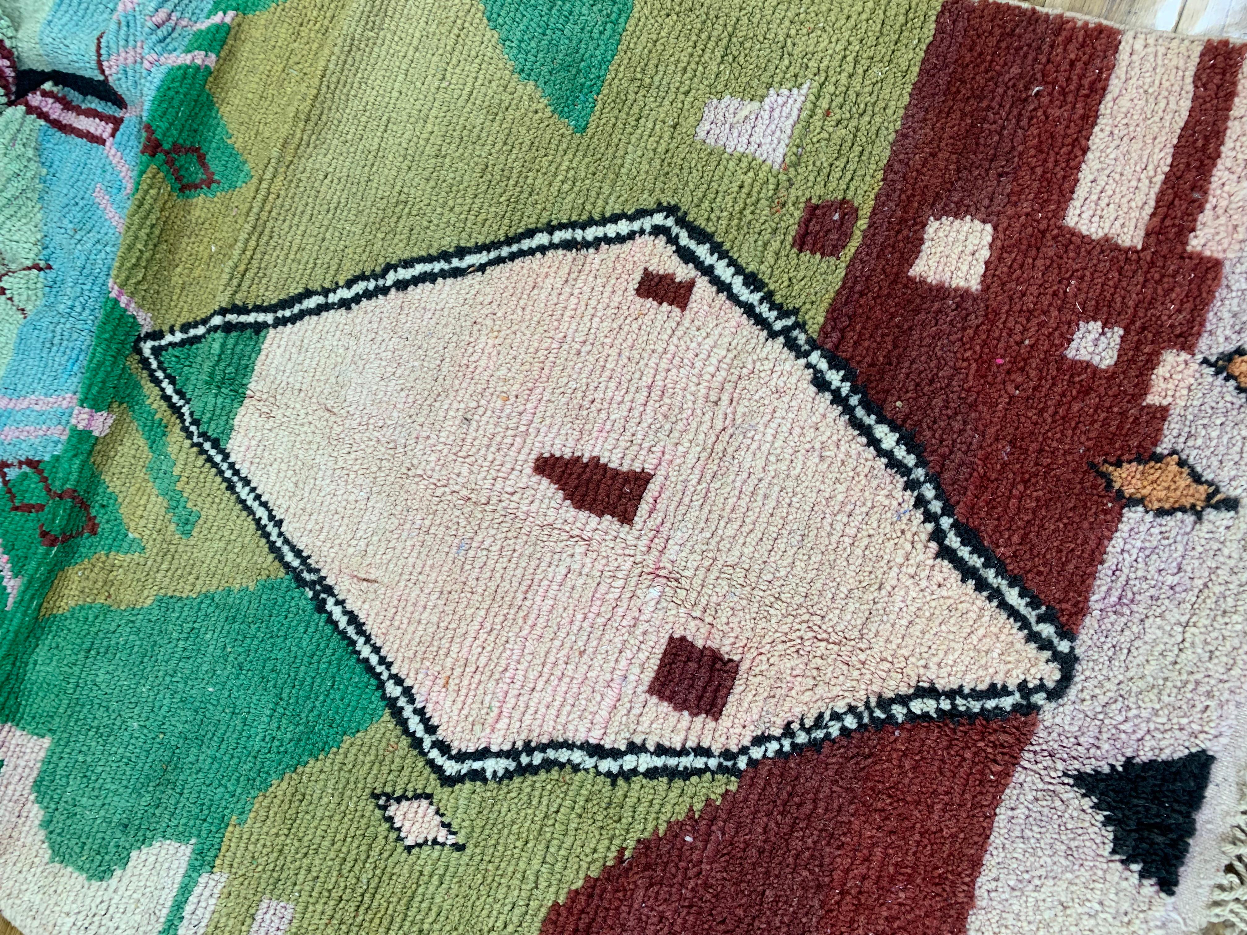This distinctive rug features an abstract geometric design with layered shapes and symbolic lines, creating a visually striking centerpiece for any room. The surface shows a handwoven, looped texture that adds depth and tactile interest.