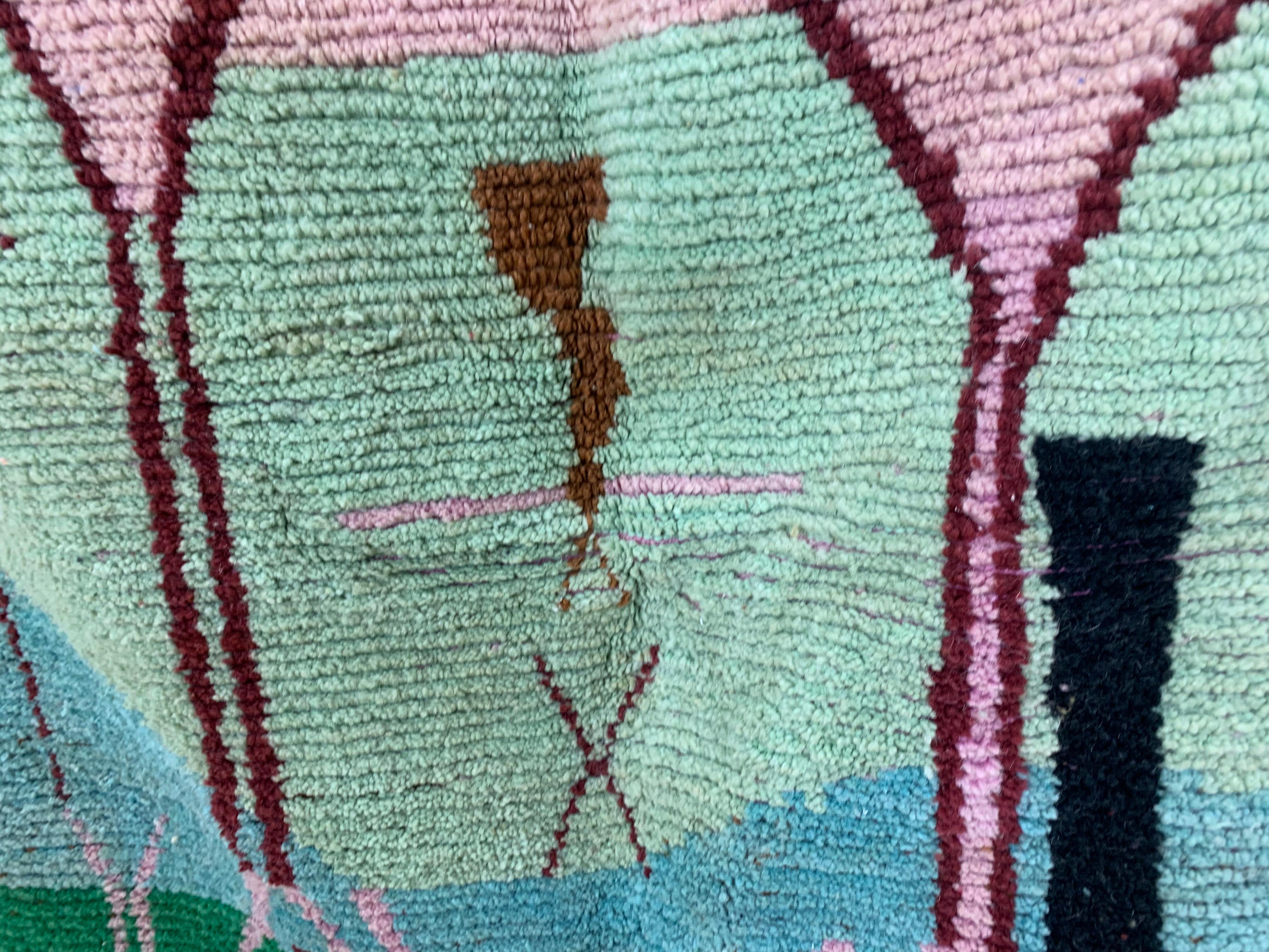 Artistic handwoven rug with abstract geometric patterns in soft pastel greens, pinks, and blues. A textured, modern statement piece for stylish interiors.