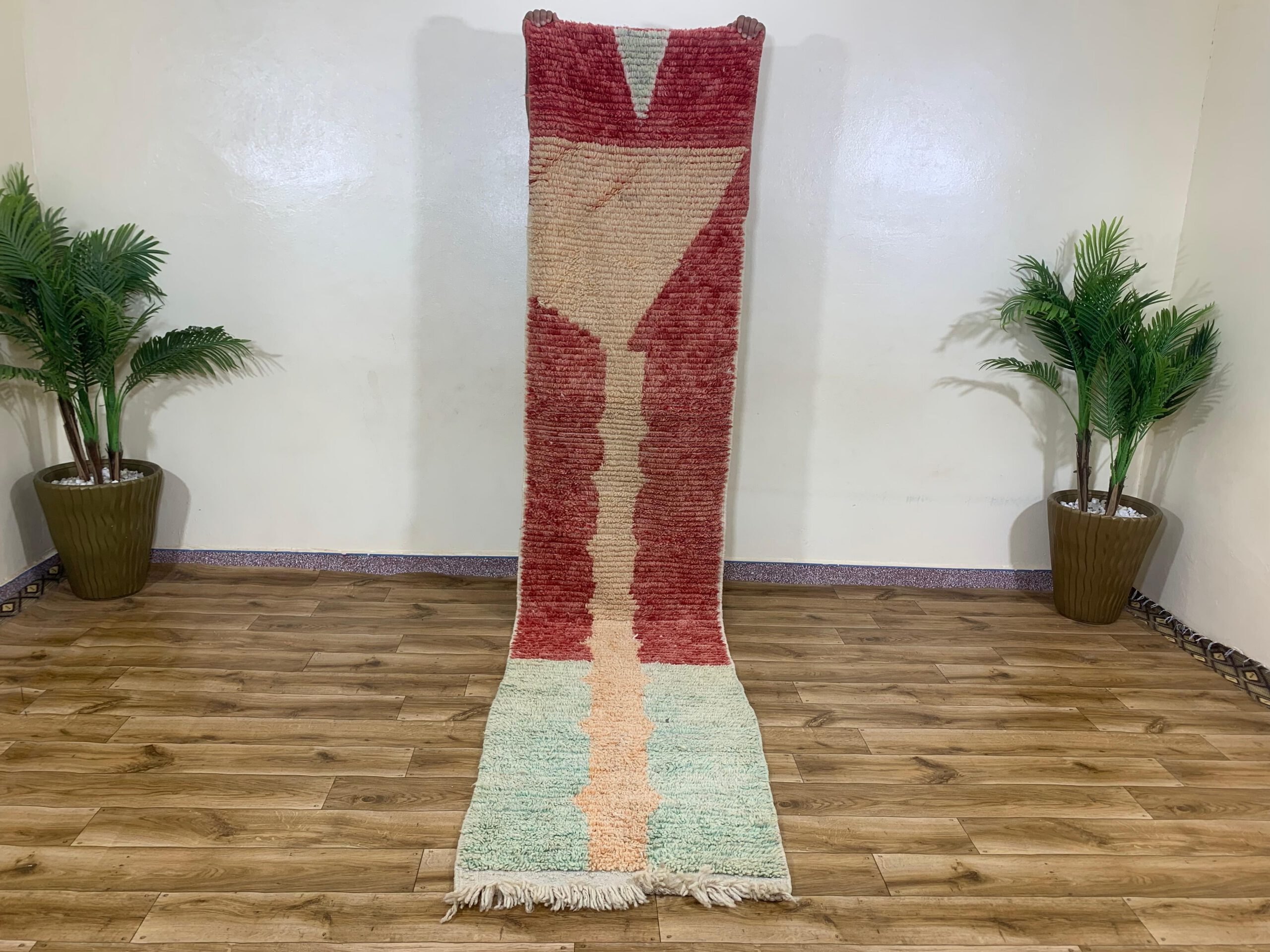 Abstract runner rug with a textured pile and geometric pattern in terracotta, beige, peach, and mint green. Long and narrow with fringed ends, perfect for hallways and entryways.