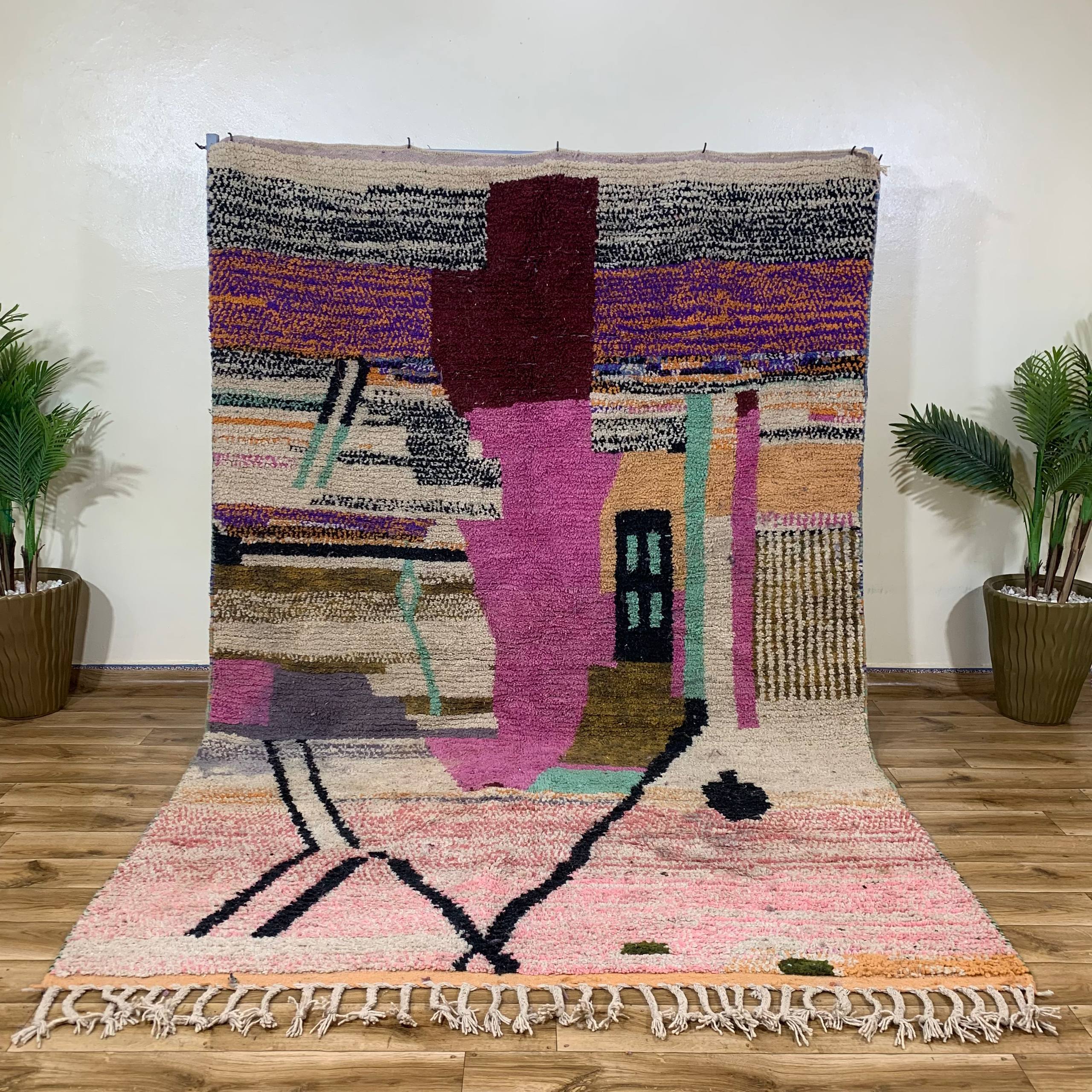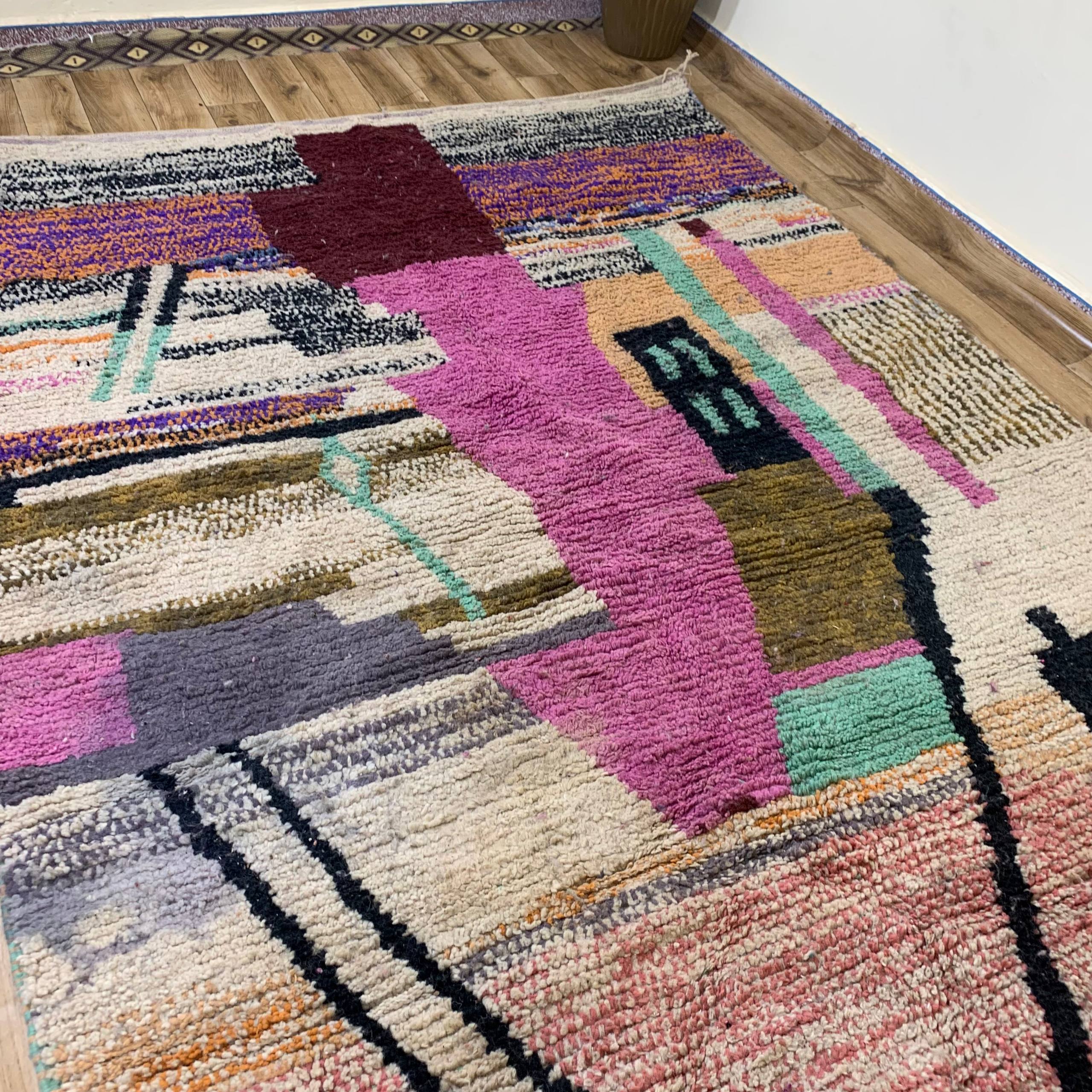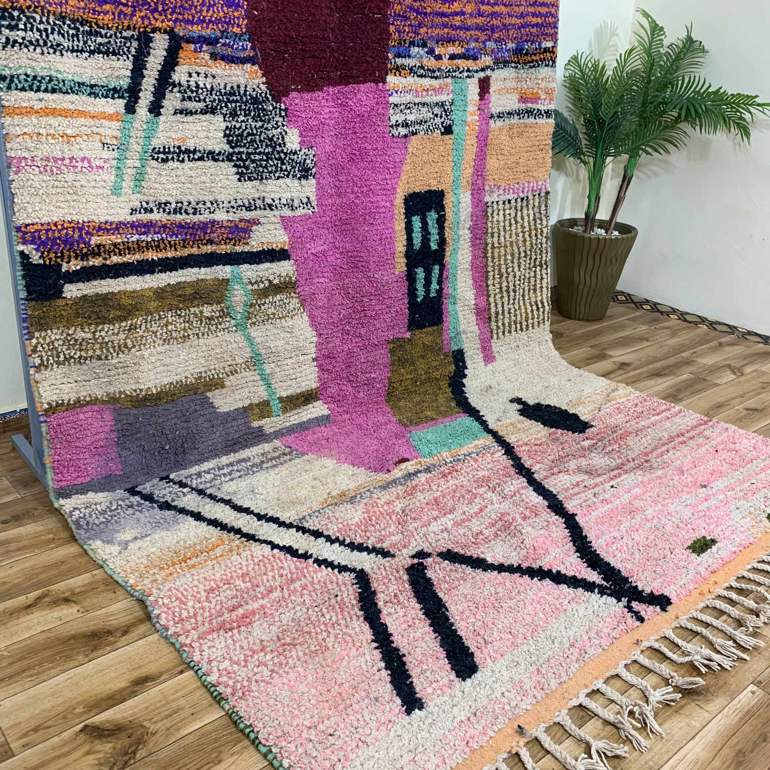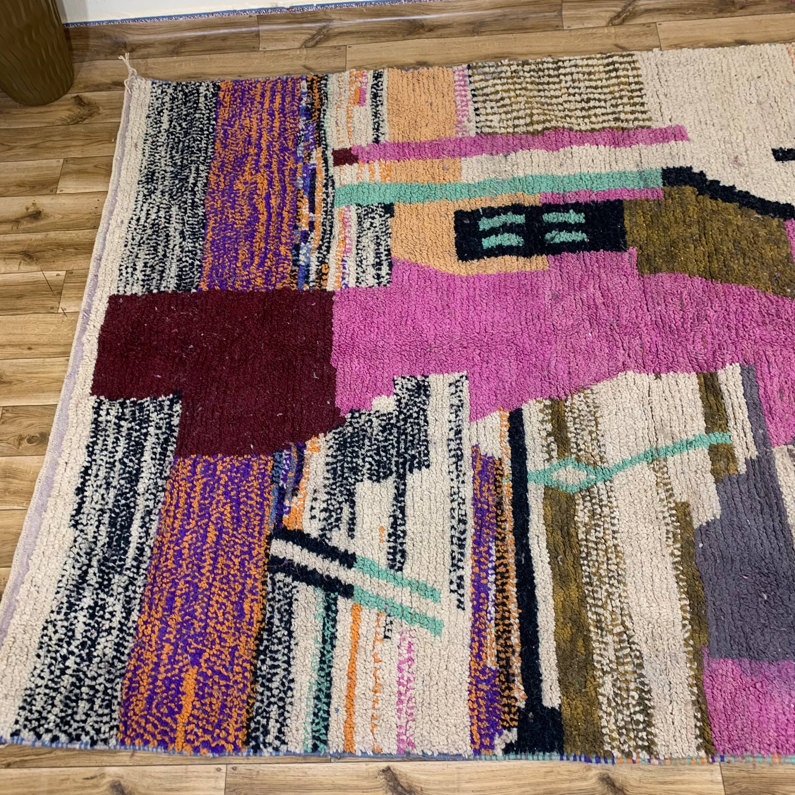 Vibrant abstract handwoven rug featuring a bold, artistic composition inspired by geometric forms and playful color blocking. The rug showcases a rich palette of pink, purple, teal, cream, mustard, black, and earthy tones arranged in an expressive, modern pattern.