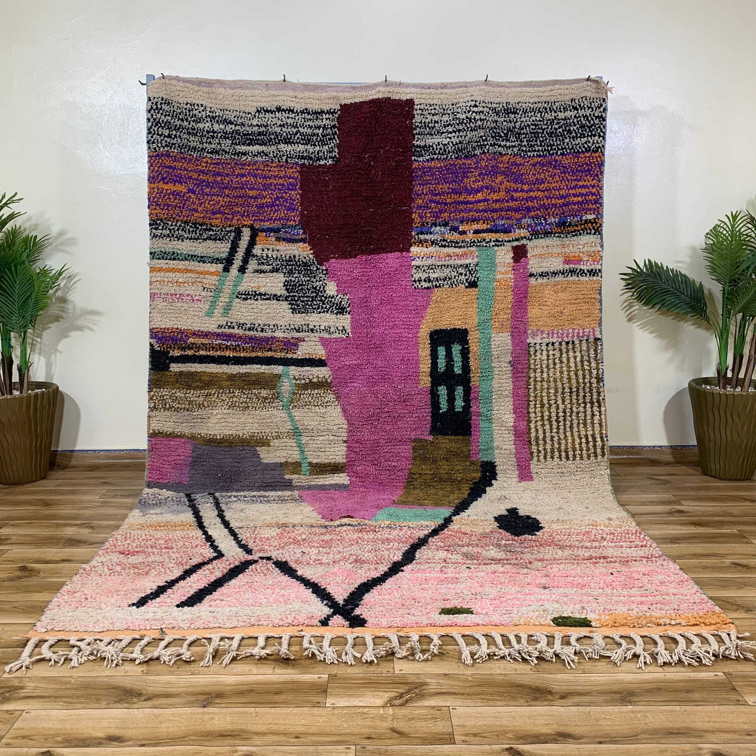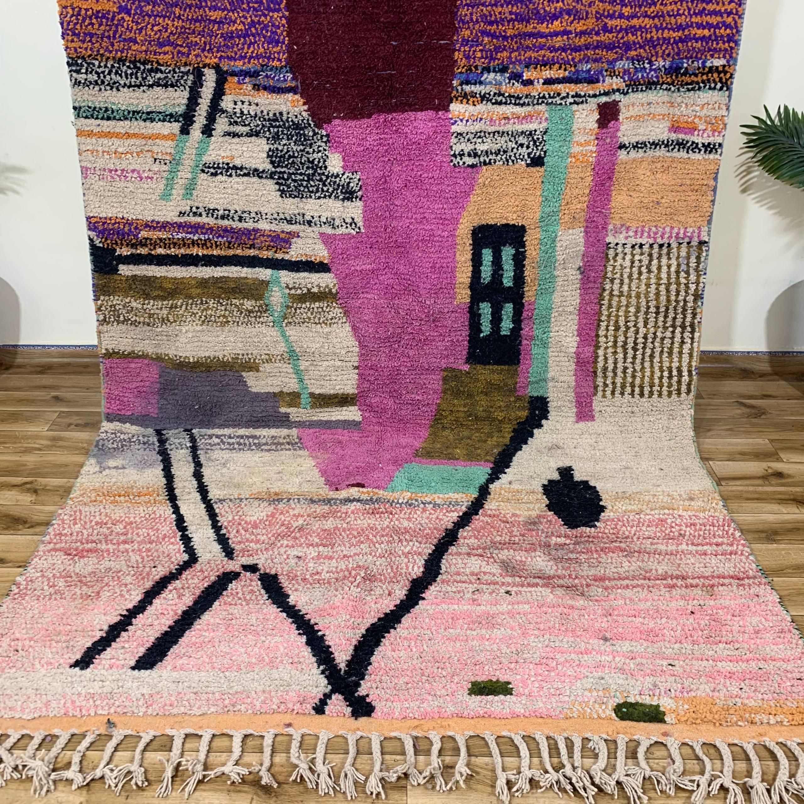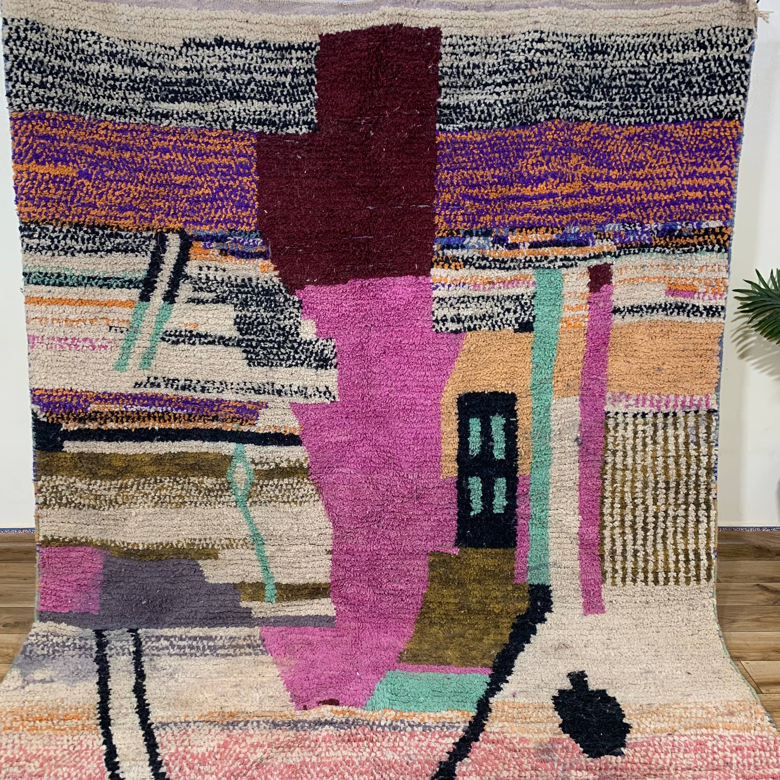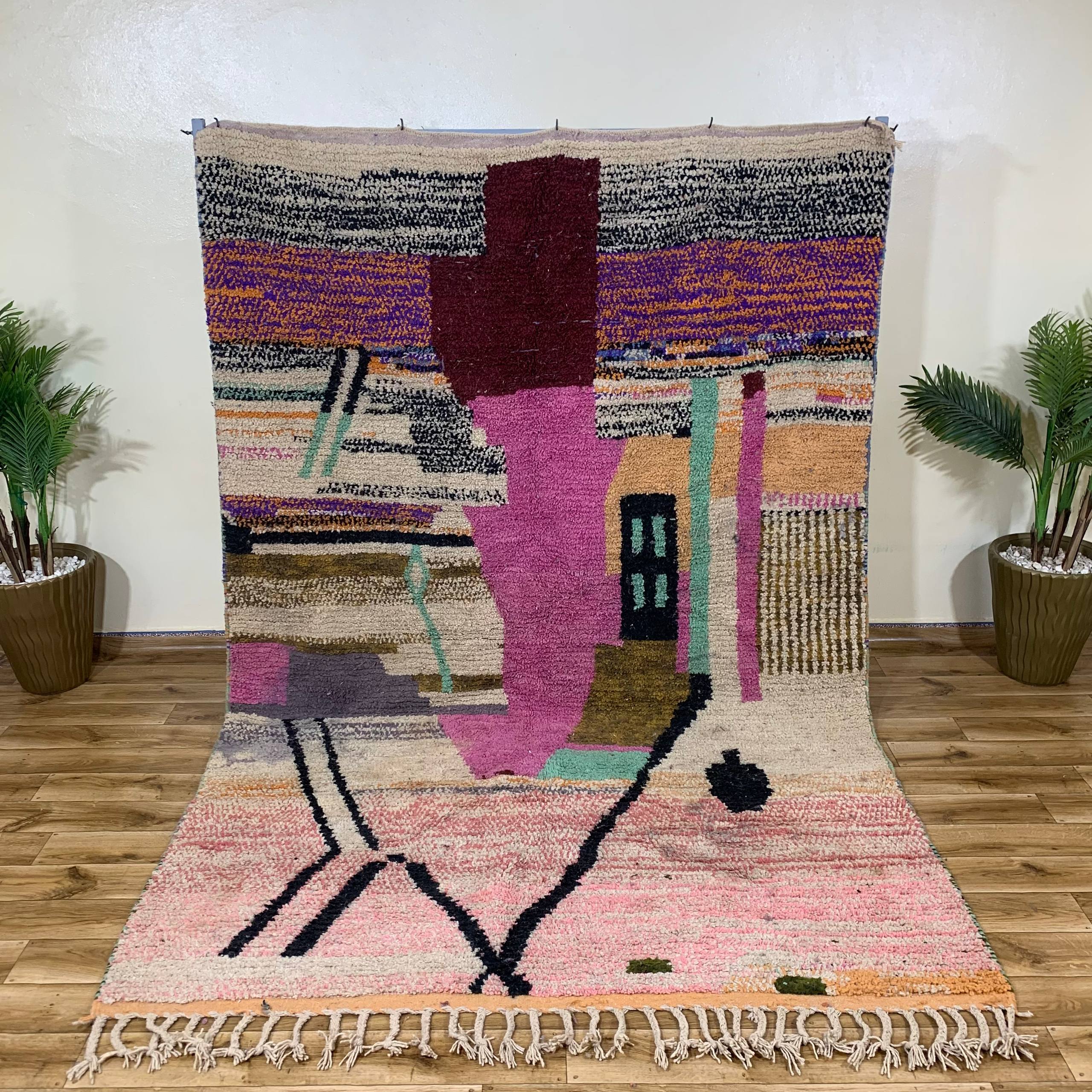 Vibrant abstract handwoven rug featuring a bold, artistic composition inspired by geometric forms and playful color blocking. The rug showcases a rich palette of pink, purple, teal, cream, mustard, black, and earthy tones arranged in an expressive, modern pattern.