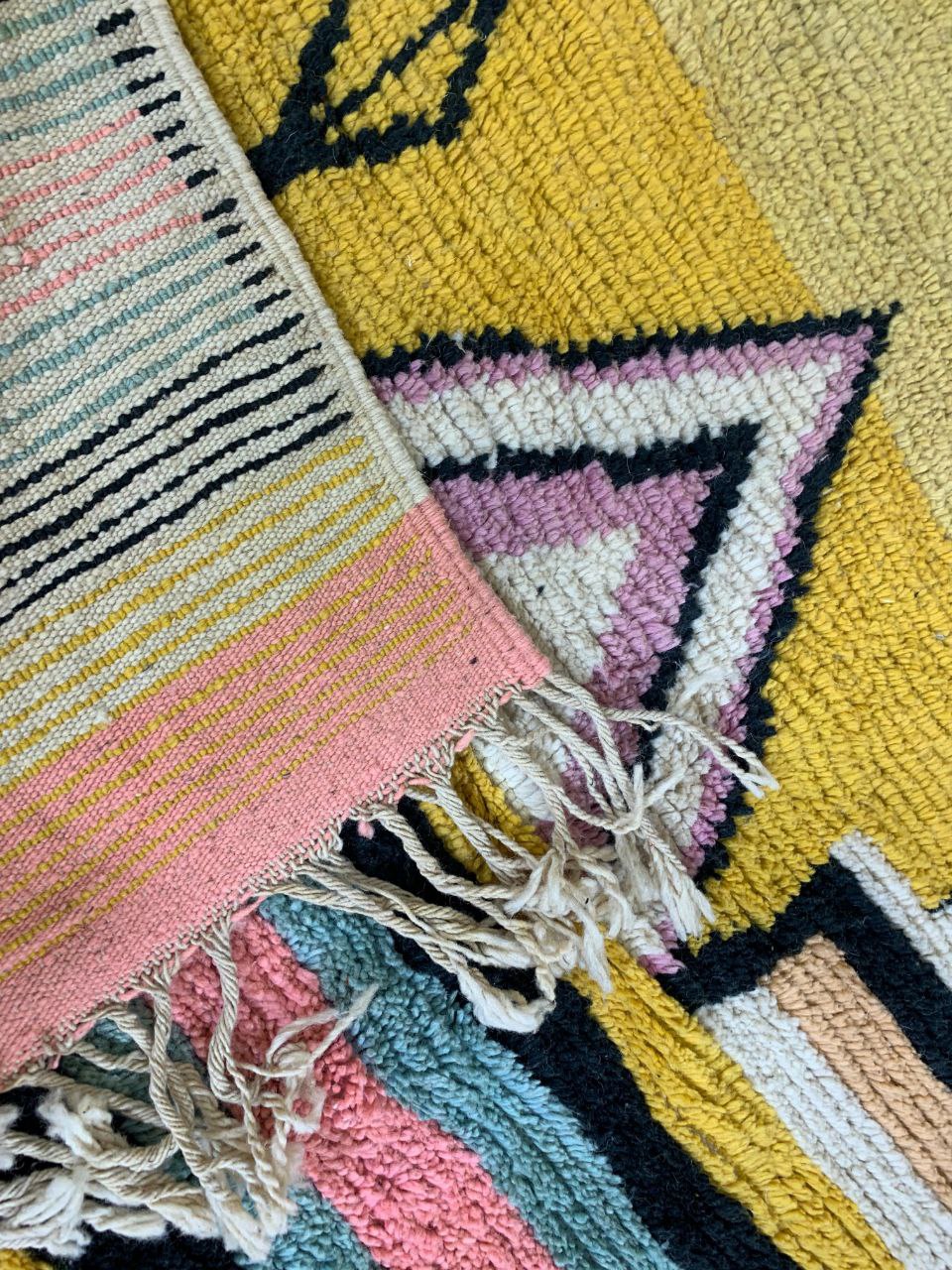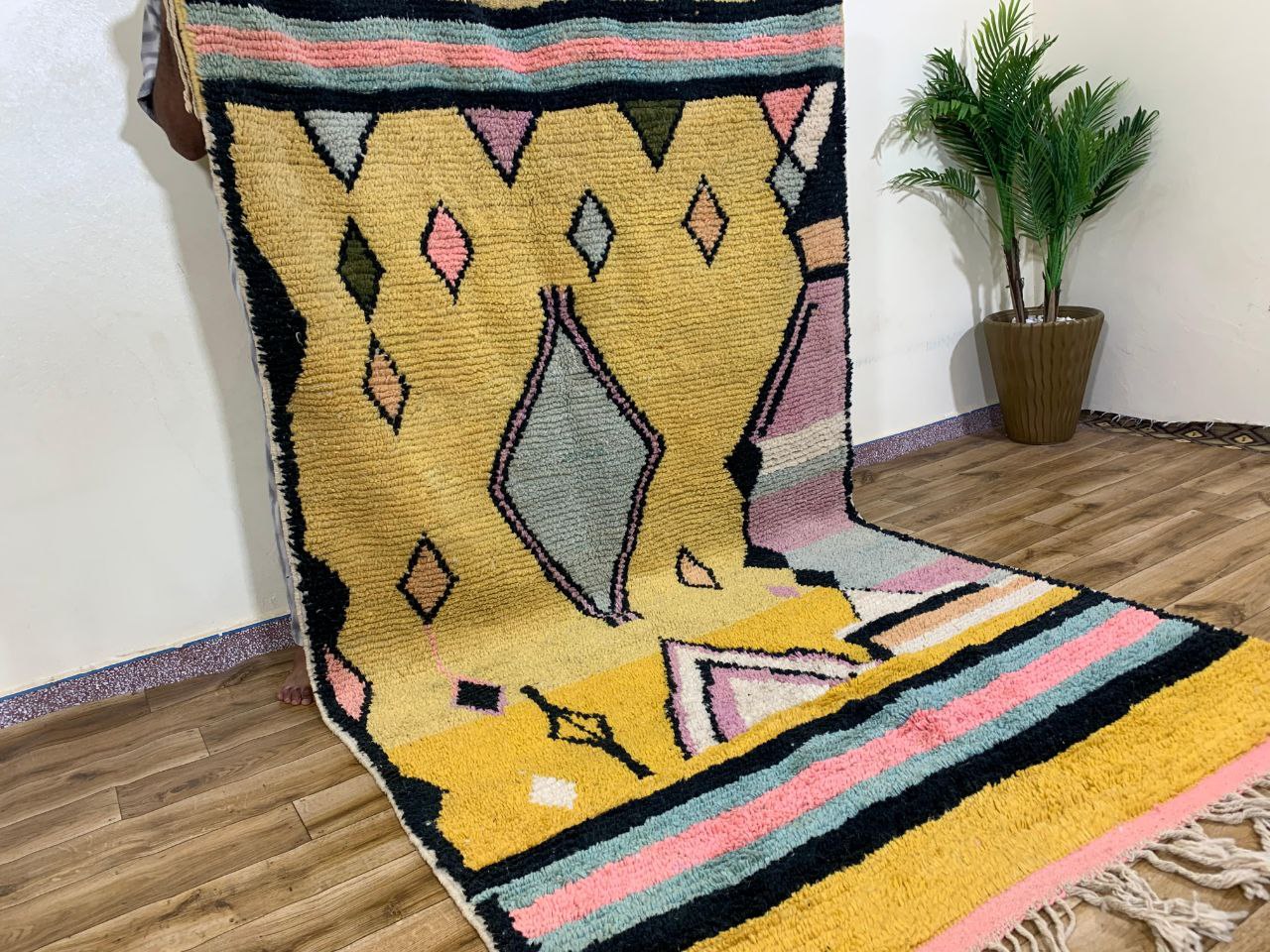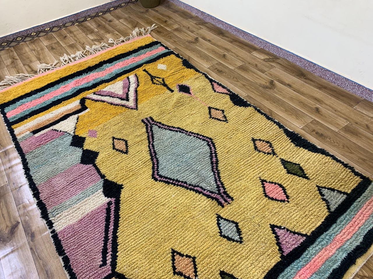 Eye-catching geometric tribal rug featuring a mustard yellow base with pastel pink, mint, blue, and black accents. Plush texture and bold patterns make it perfect for boho and eclectic interiors.