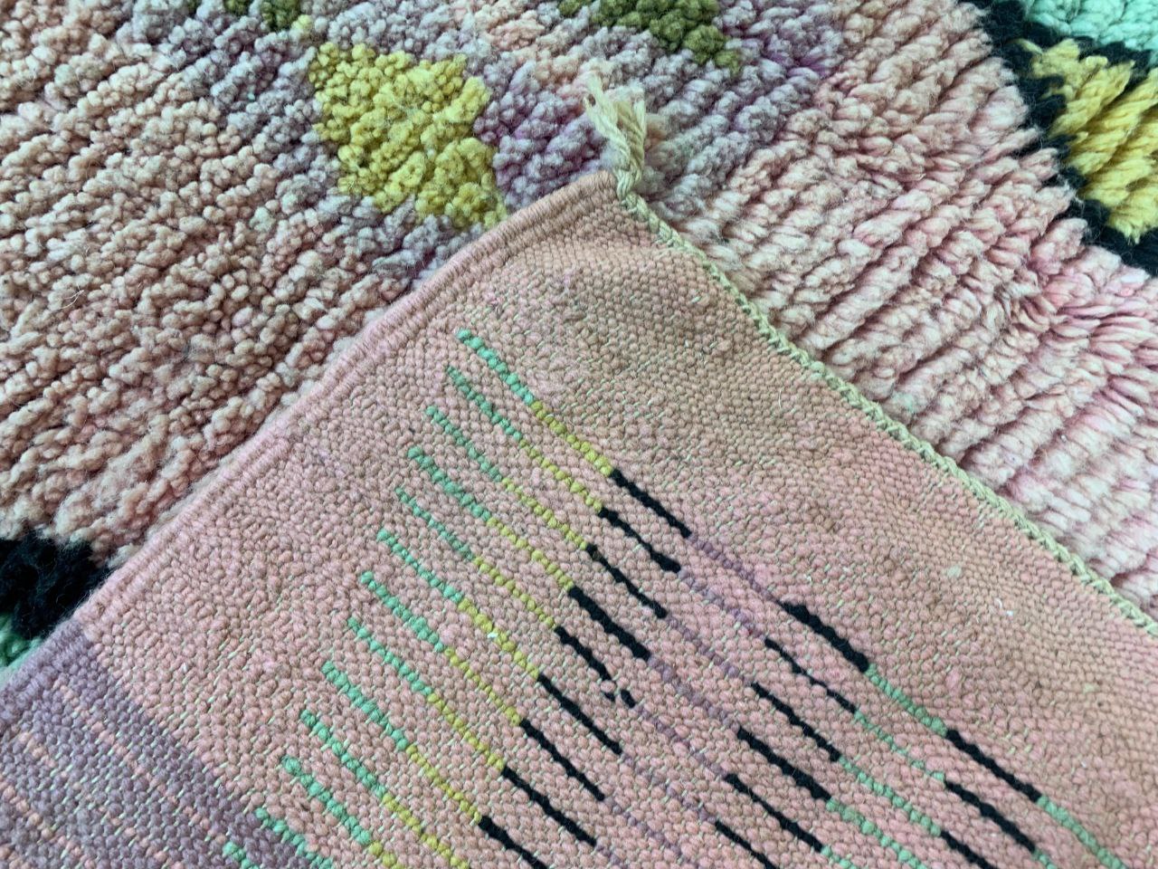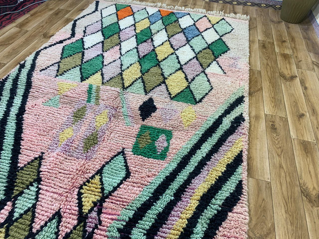 Handmade Geometric Tufted Rug with Pink Base and Multicolor Diamond Pattern
