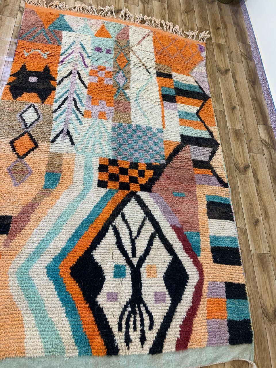 Handwoven Abstract Geometric Shag Rug with Multicolor Pattern and Fringe