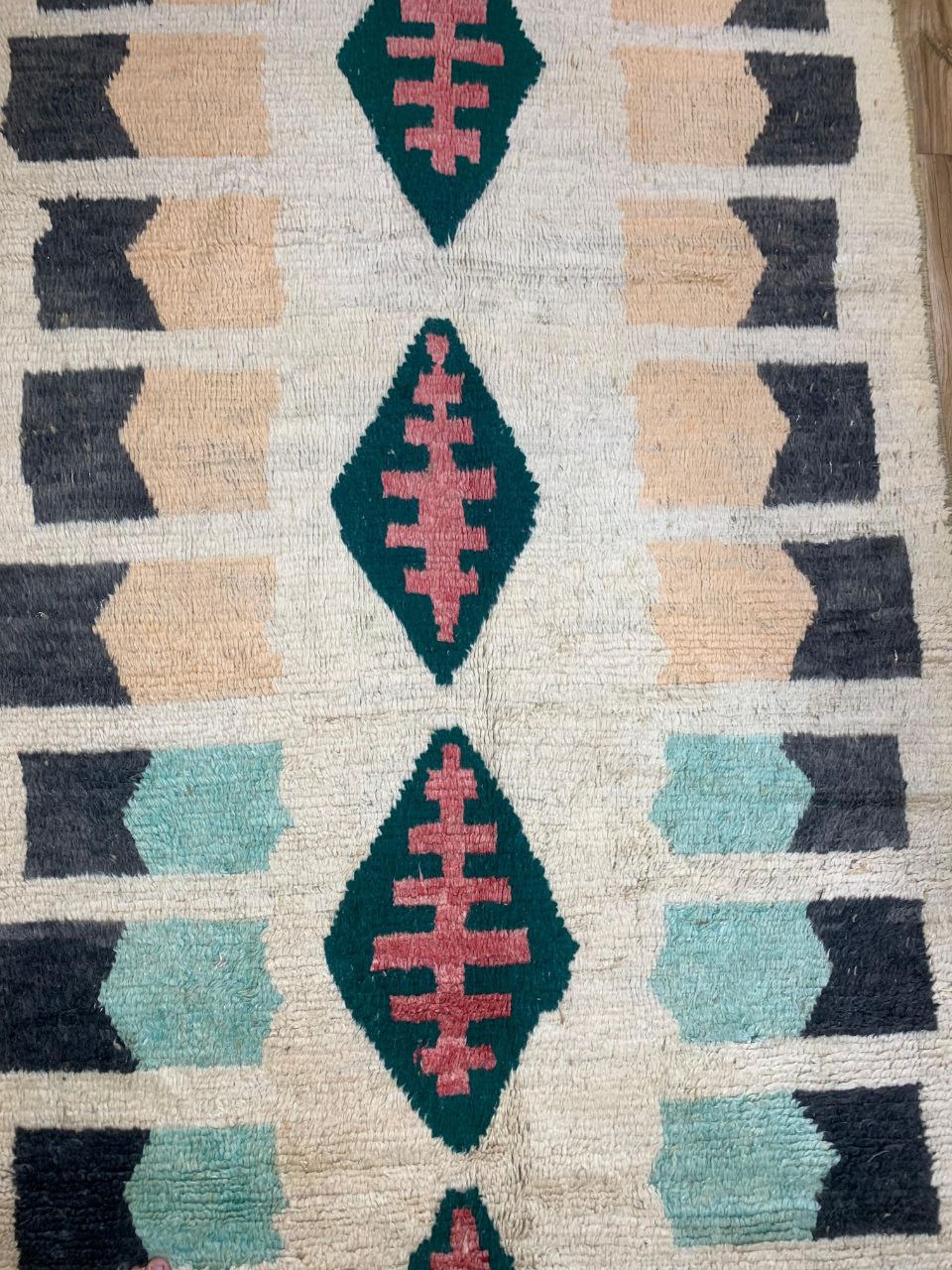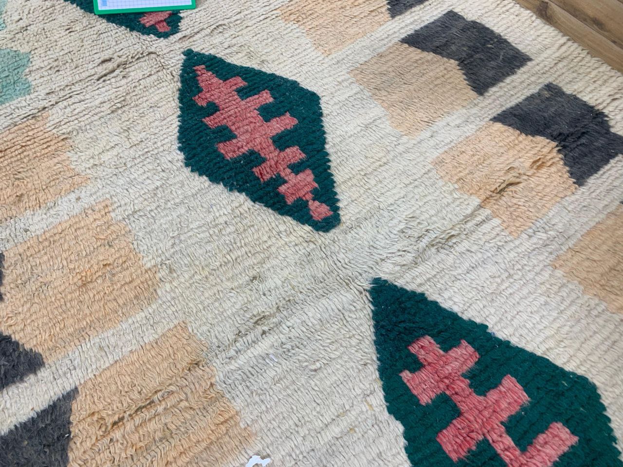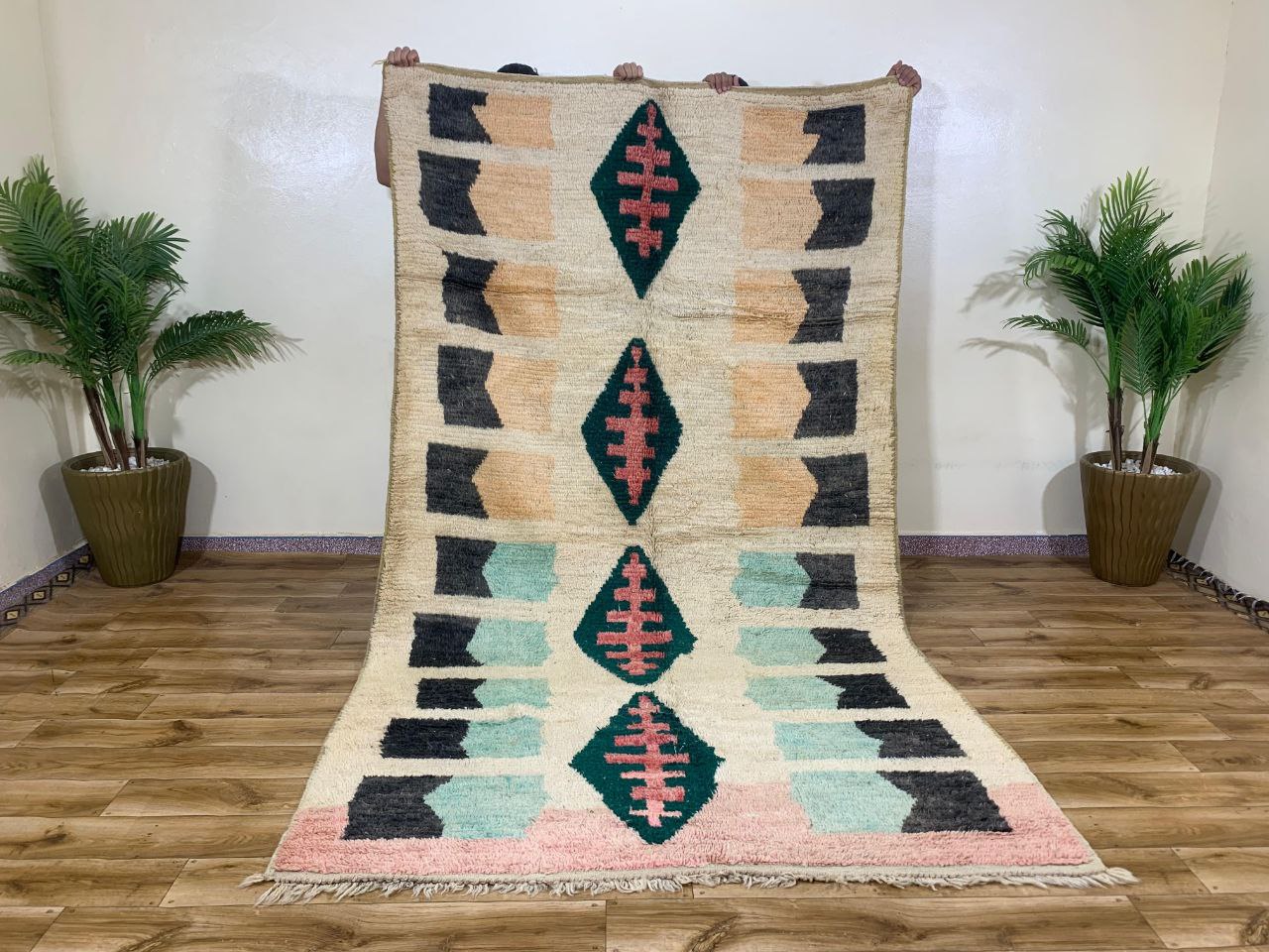Elevate your space with this beautifully crafted geometric wool rug. Featuring a soft cream background, this rug is accented with bold diamond motifs running down the center, highlighted in deep green with coral detailing. The sides showcase rhythmic geometric blocks in charcoal, sand, mint, and blush tones, creating a balanced and eye-catching design.