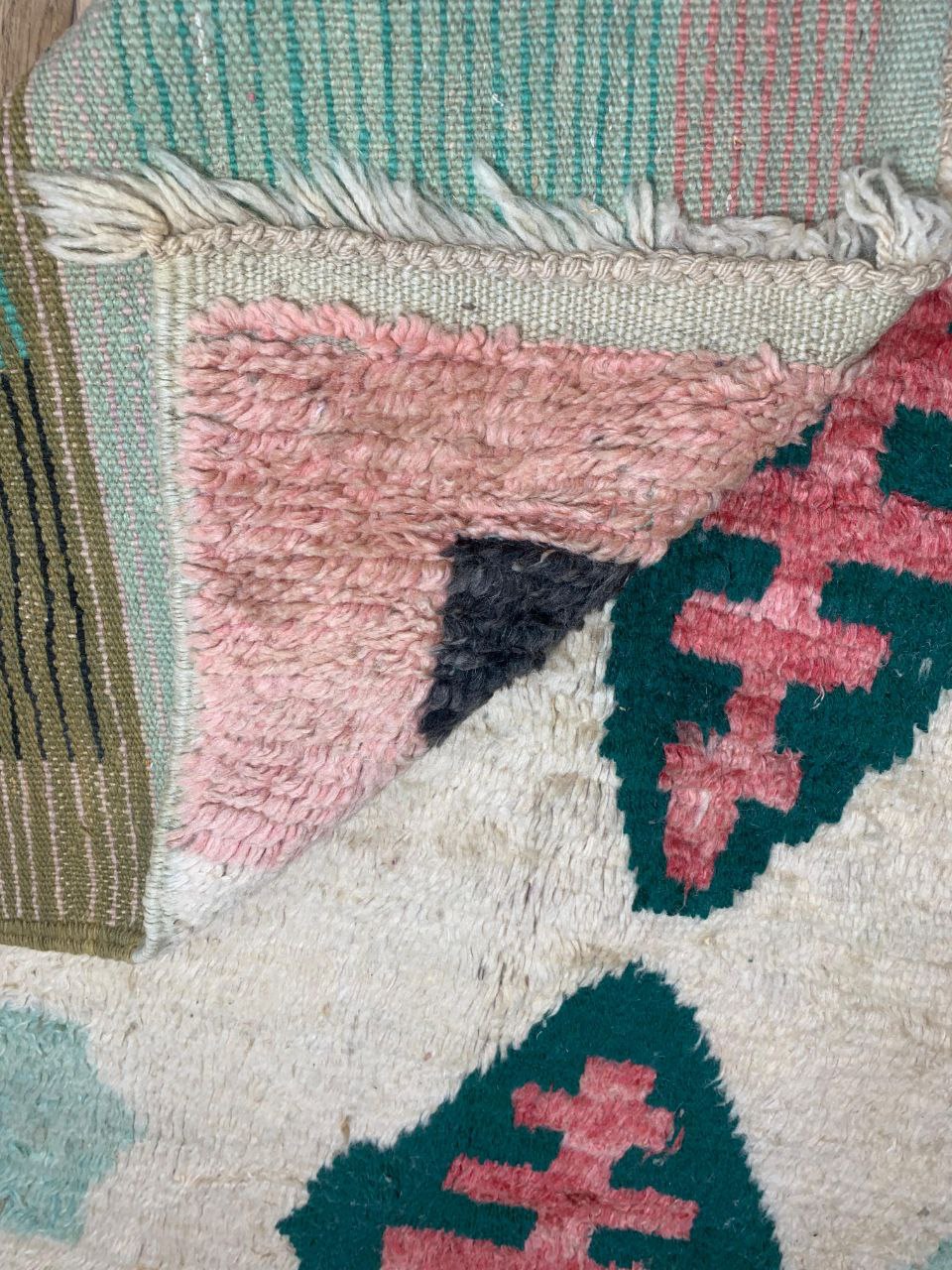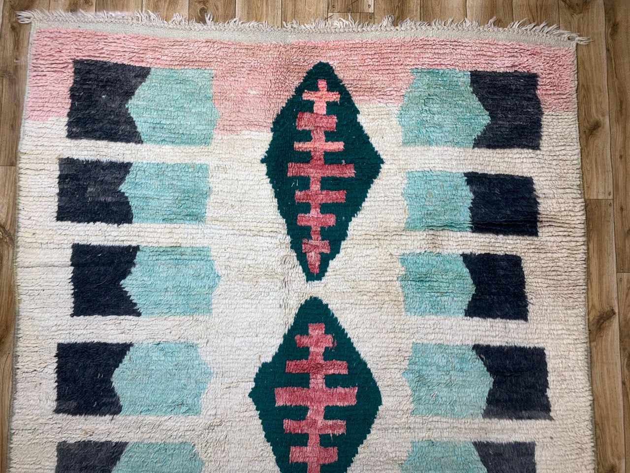 Handmade Geometric Tufted Rug with Pink Base and Multicolor Diamond Pattern