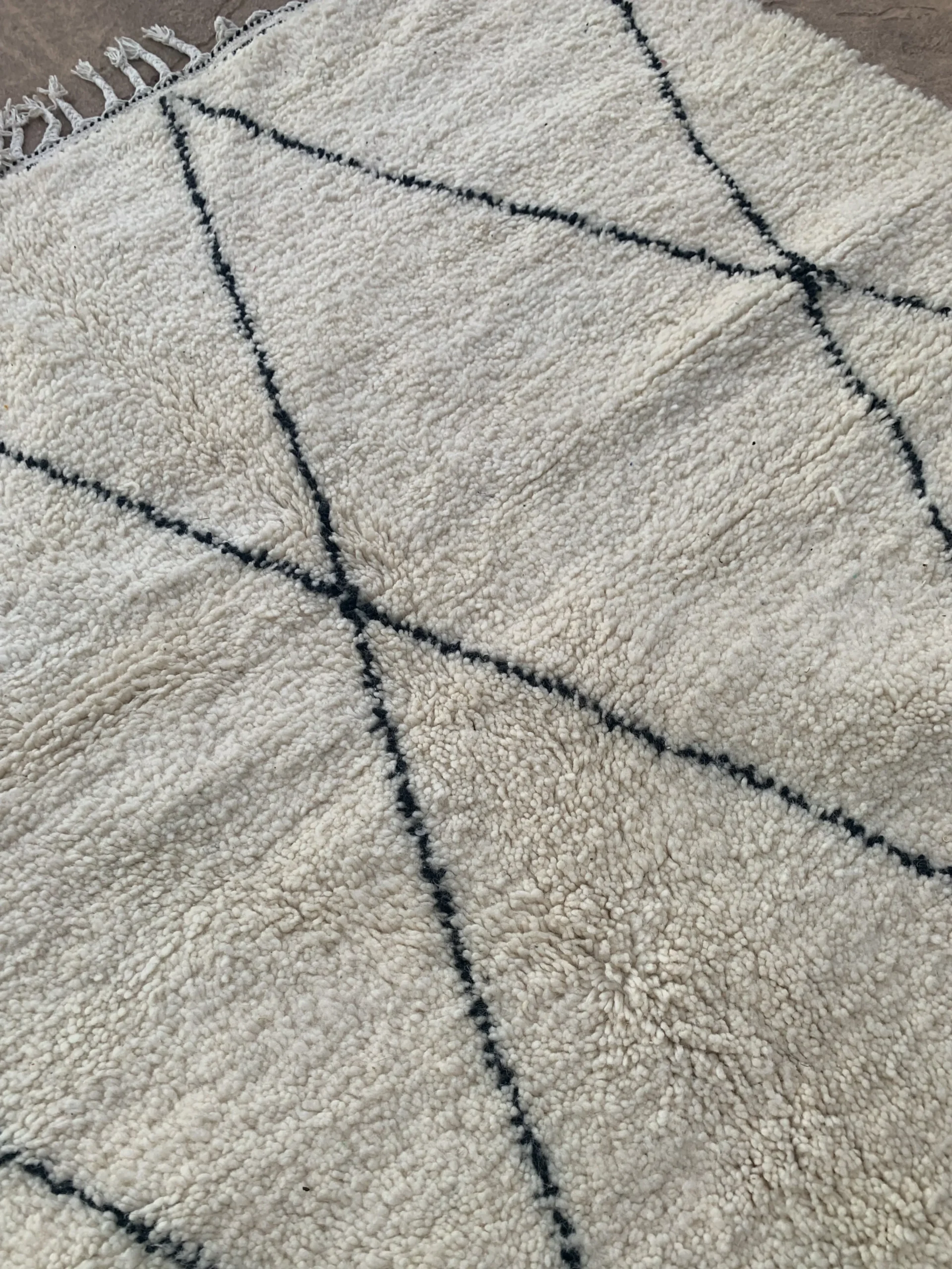 This rug features a soft ivory/cream wool base decorated with a minimalist black diamond lattice pattern. The thick, plush pile gives it a cozy and luxurious feel, while the simple geometric lines create a timeless look that works beautifully in both modern and bohemian interiors.