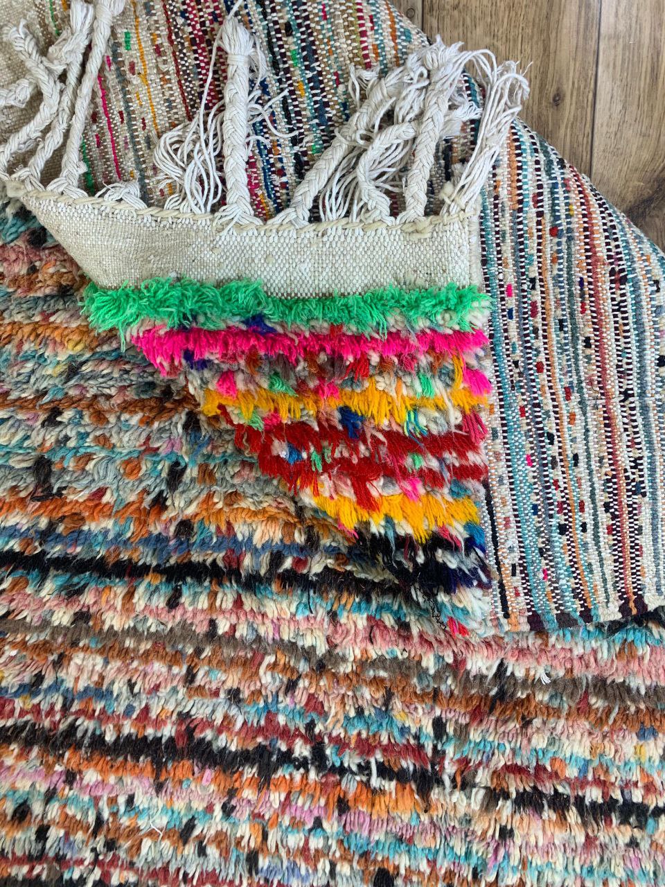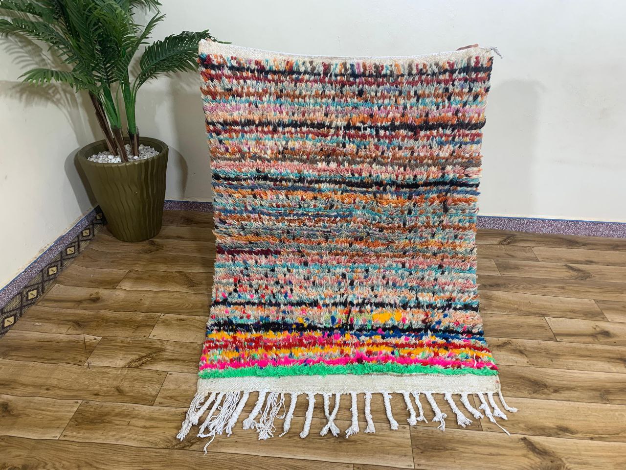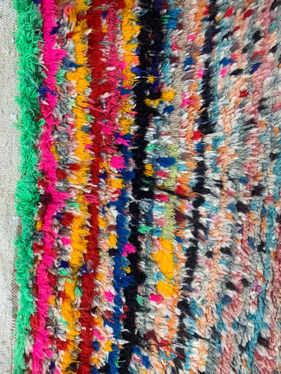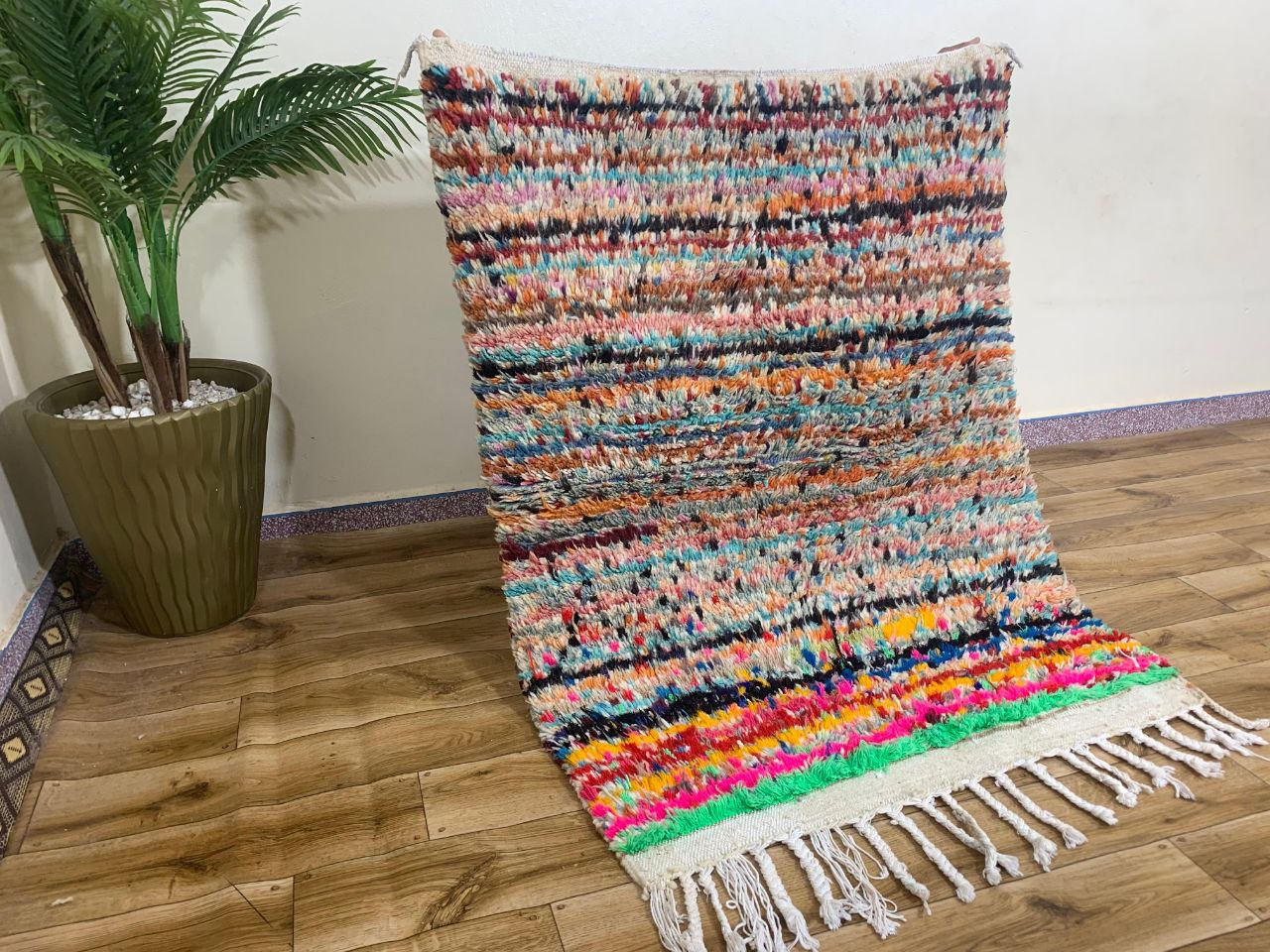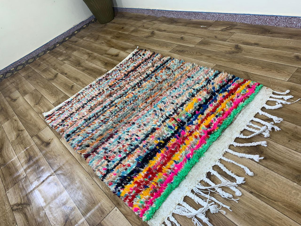 A colorful handwoven shaggy rug with vibrant stripes and fringe edges. Perfect for adding warmth, texture, and a bohemian touch to any interior space.