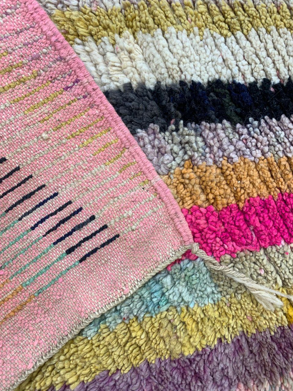 A vibrant handwoven rug with shaggy multicolor stripes and a distinctive pink flatwoven border, perfect for adding warmth and bohemian character to any space.