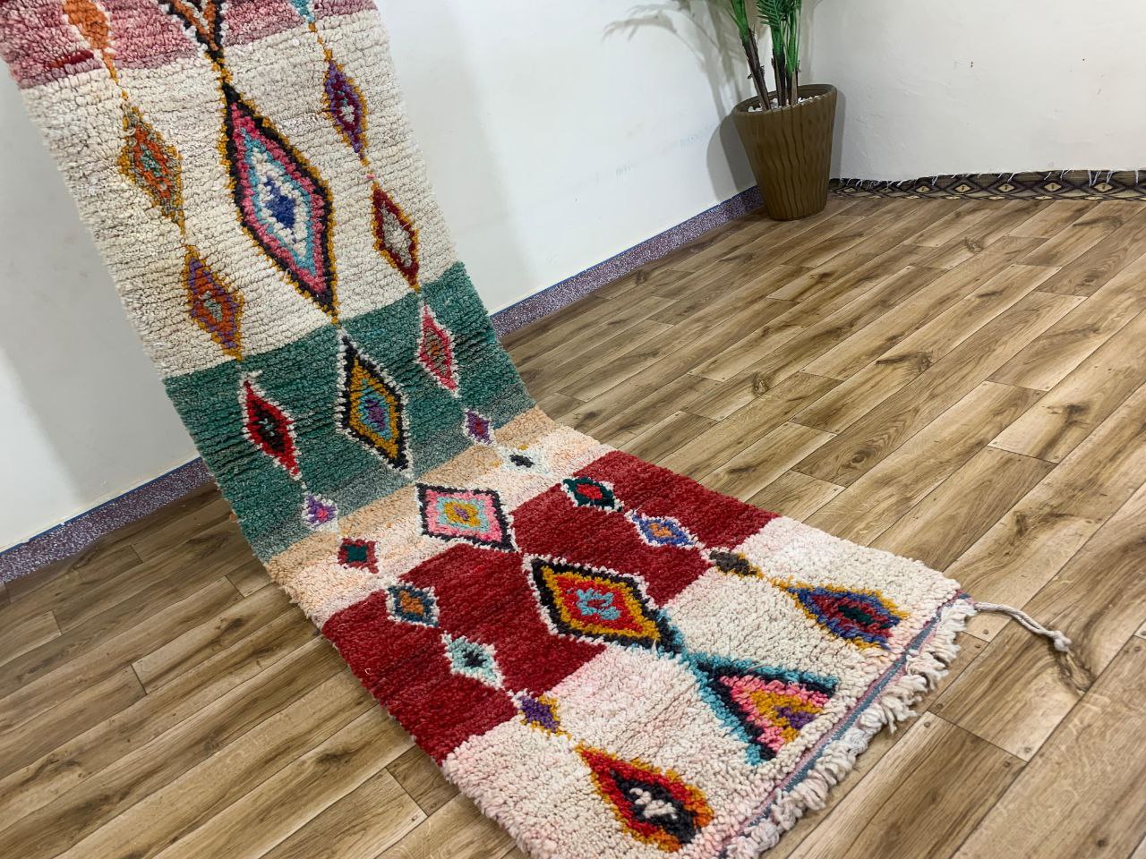 The thick, tactile pile gives a cozy underfoot feel, while the visible hand-tied fringe highlights its handcrafted nature. Ideal for adding a bohemian or eclectic touch to living rooms, bedrooms, or creative spaces.