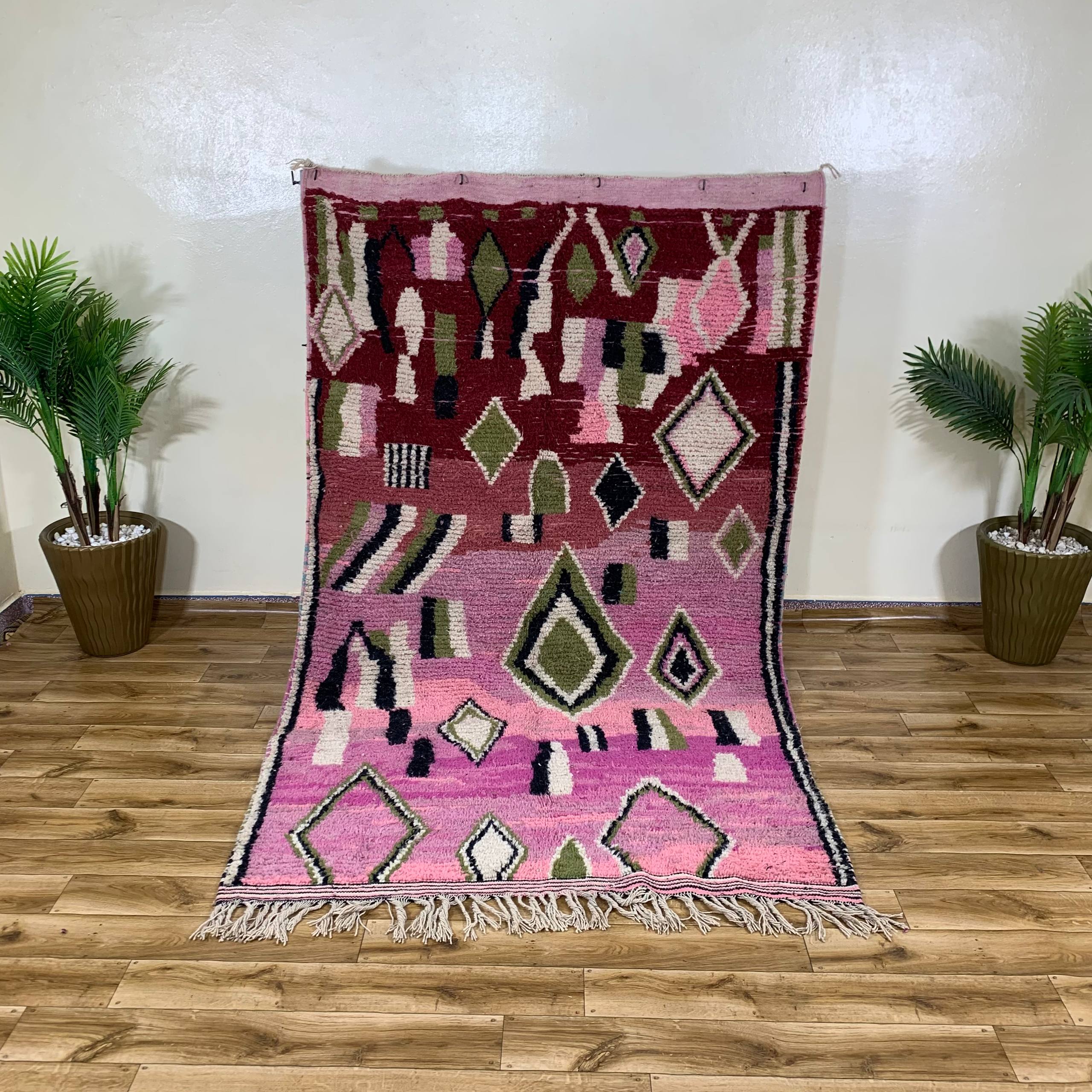 This handwoven rug features a rich blend of soft pink, blush, cream, black, and olive green tones, creating a warm and artistic textile for your space. The design combines narrow horizontal stripes with subtle dotted accents and bold geometric blocks, giving it a handcrafted, artisanal character.