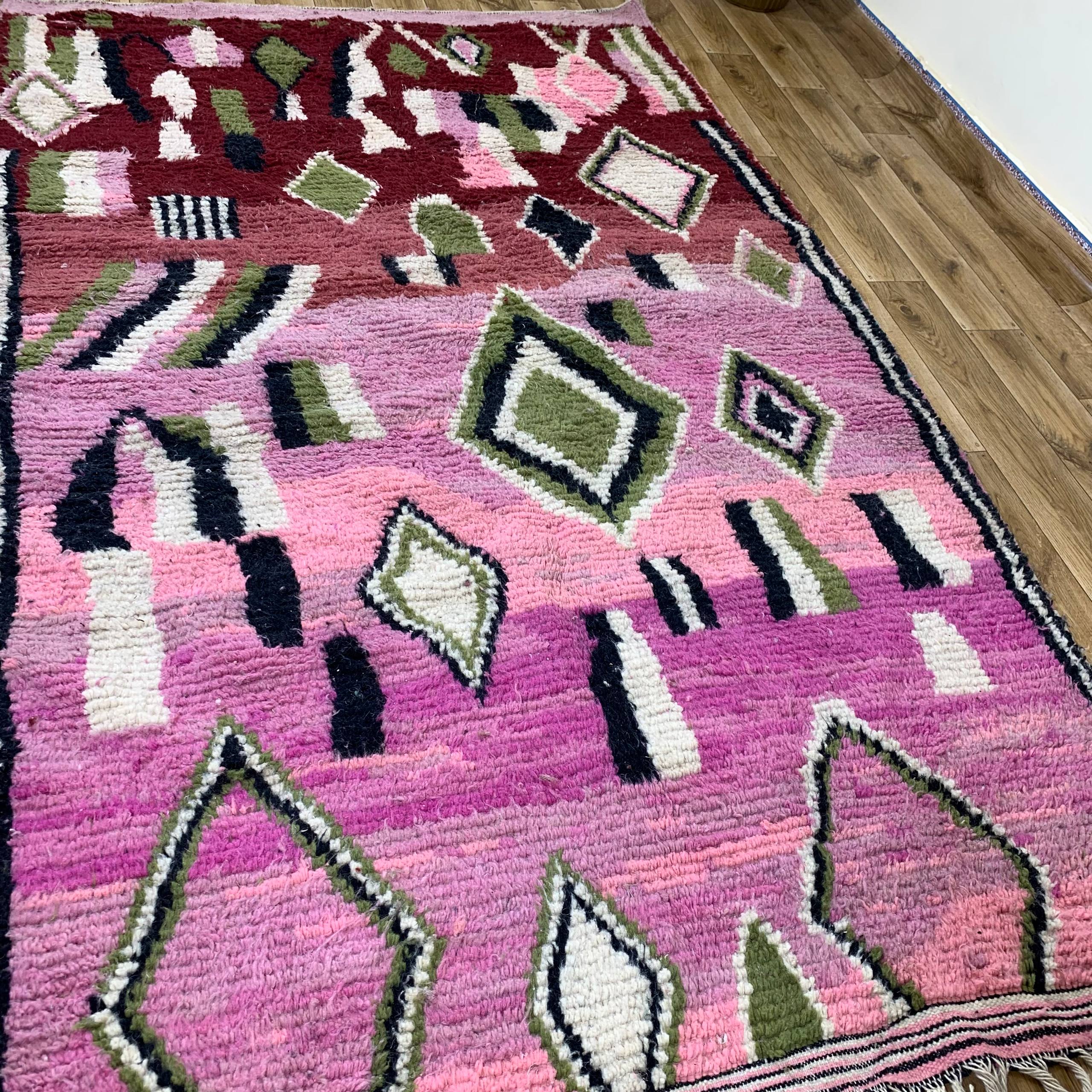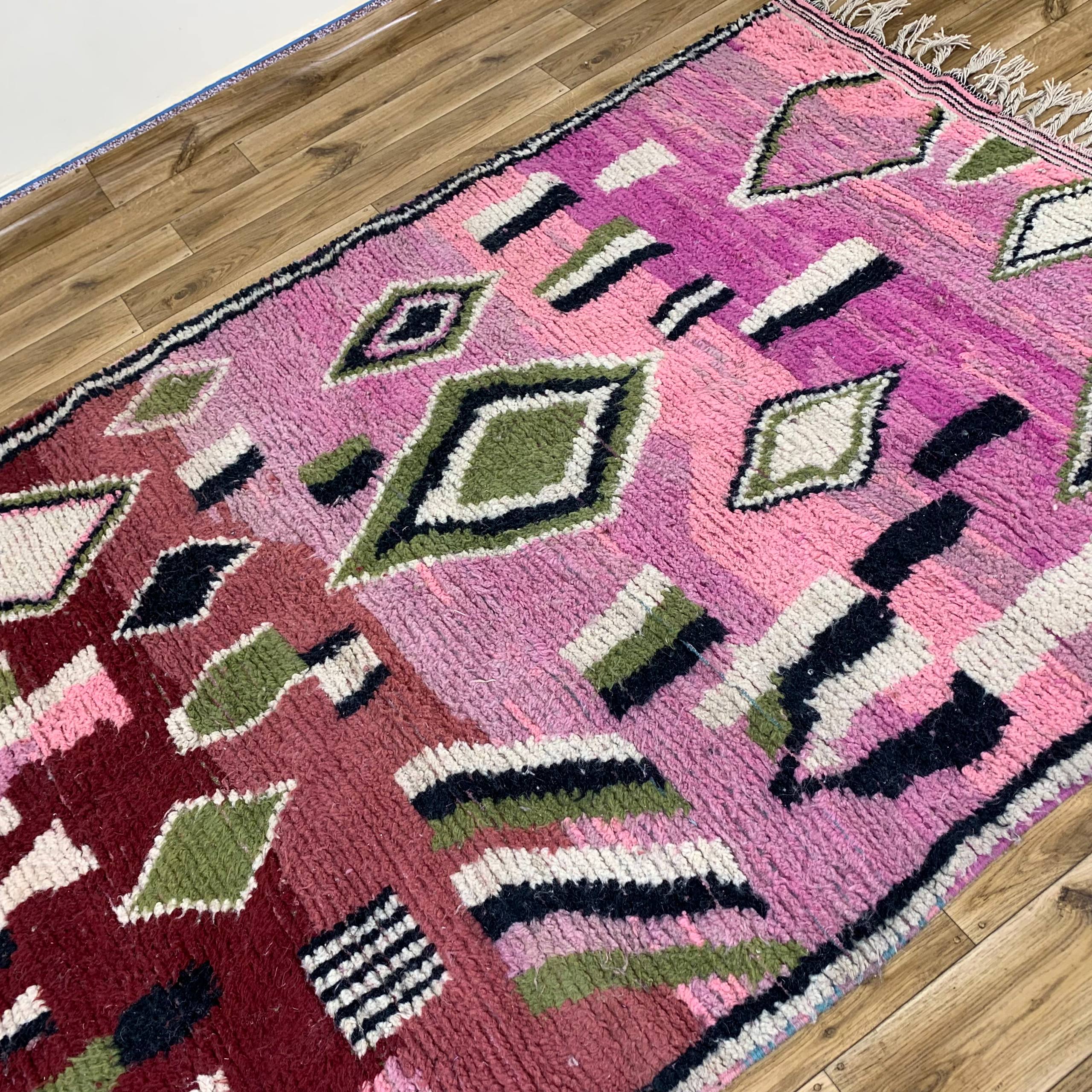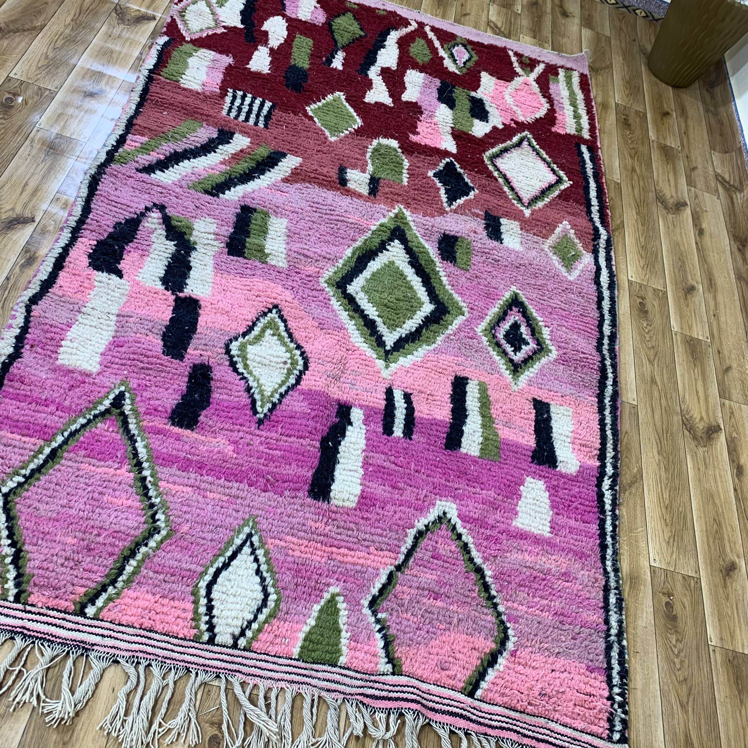 Artisan handwoven rug with pink, cream, black, and green stripes, geometric accents, and decorative fringe. A textured, cozy accent piece for bohemian and modern interiors.