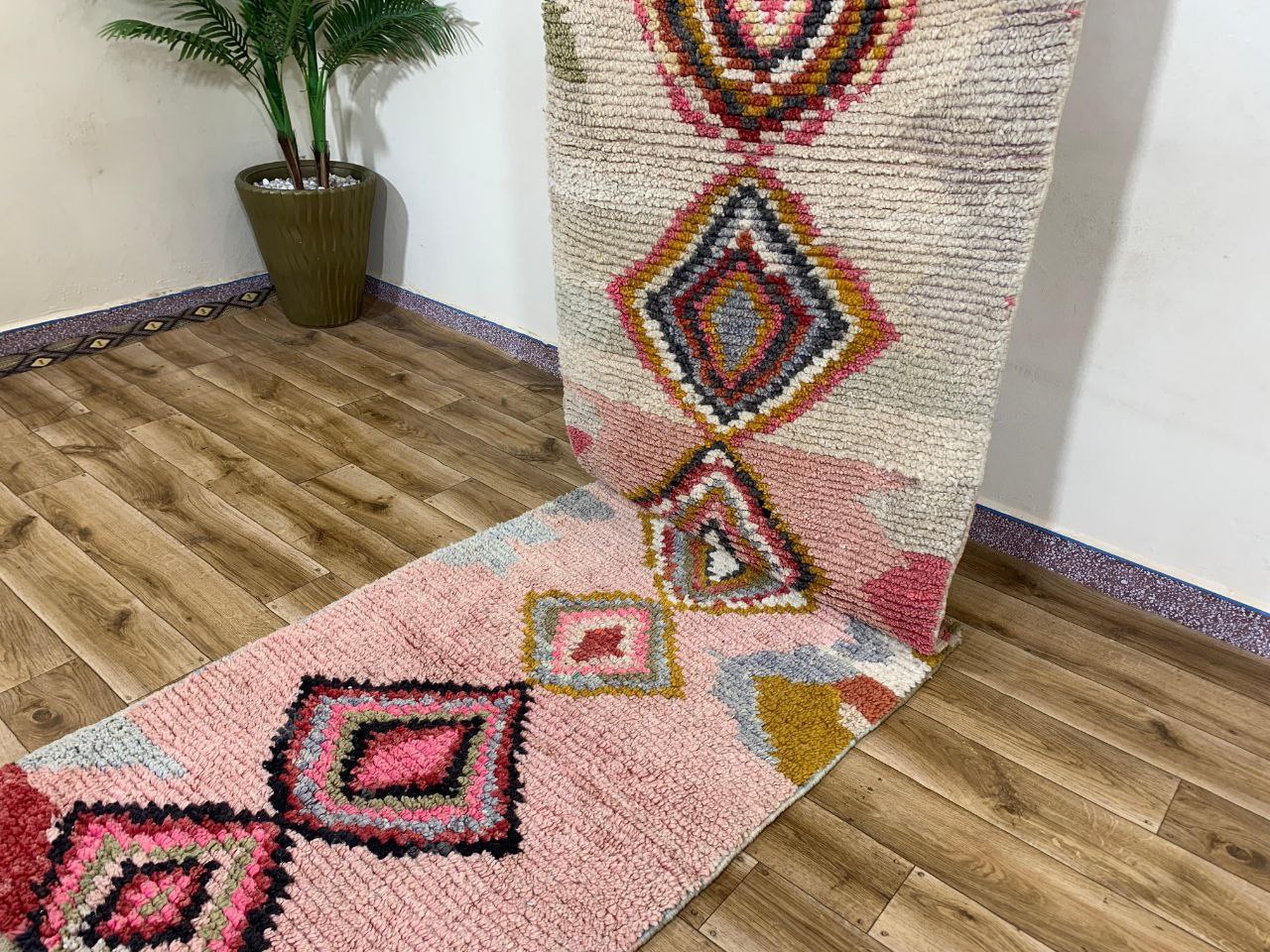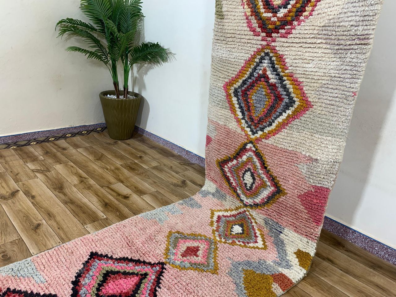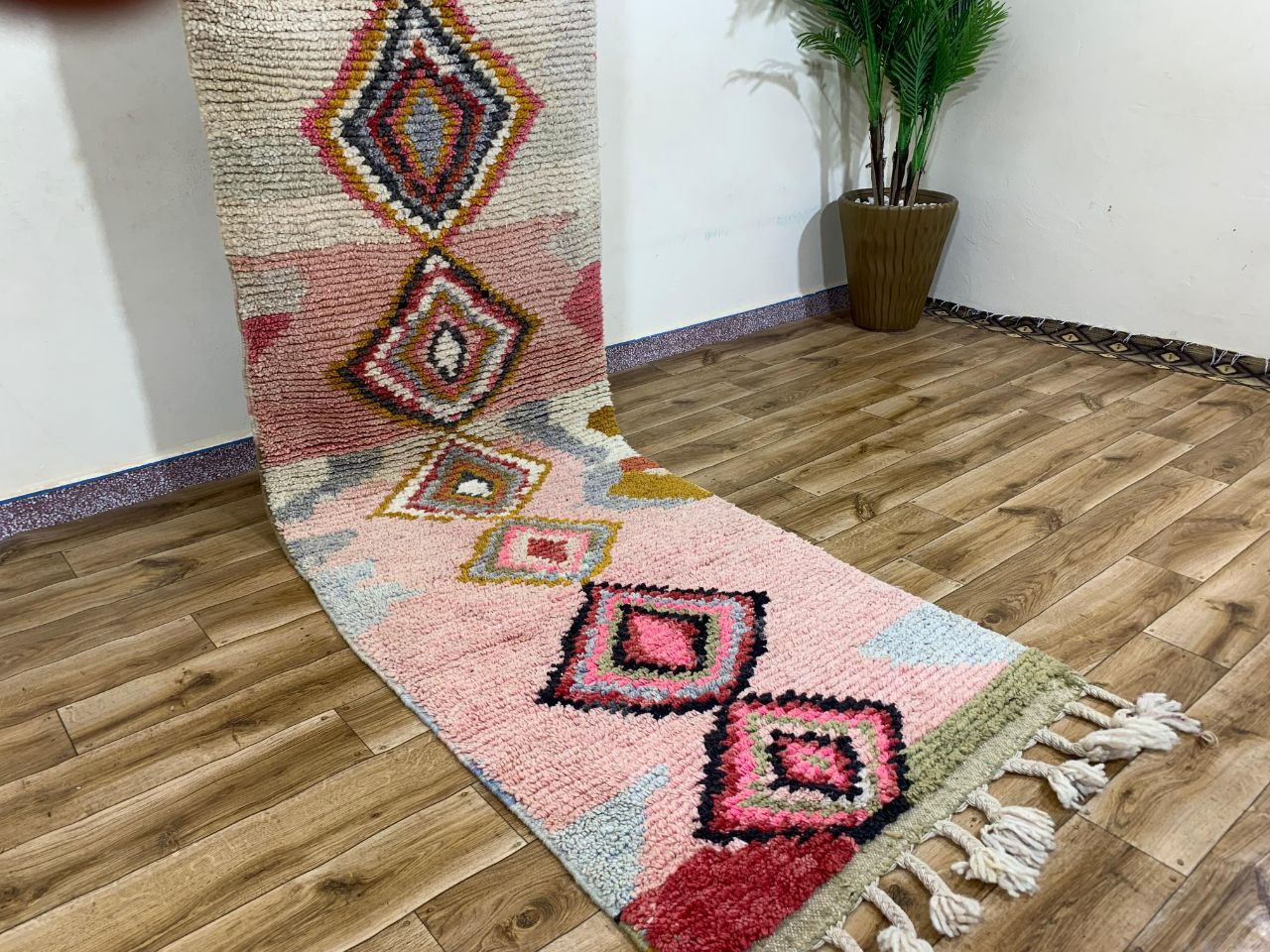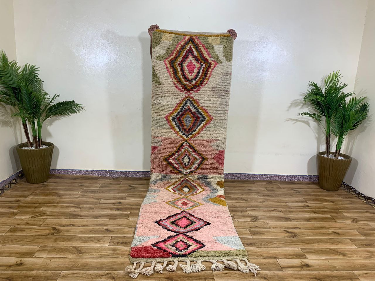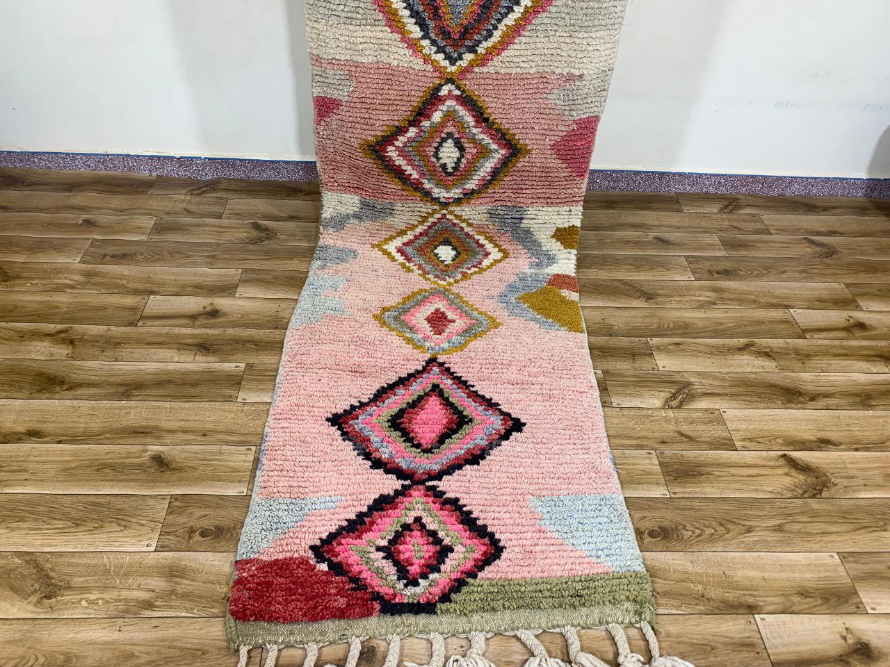 Textured geometric runner rug with diamond motifs in blush pink, cream, and sage tones. Features a plush pile and decorative fringe, perfect for hallways or accent spaces.
