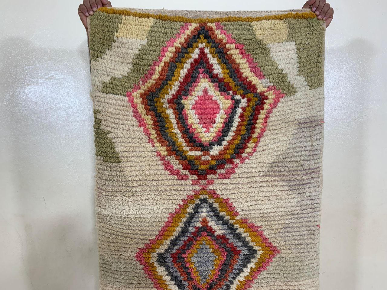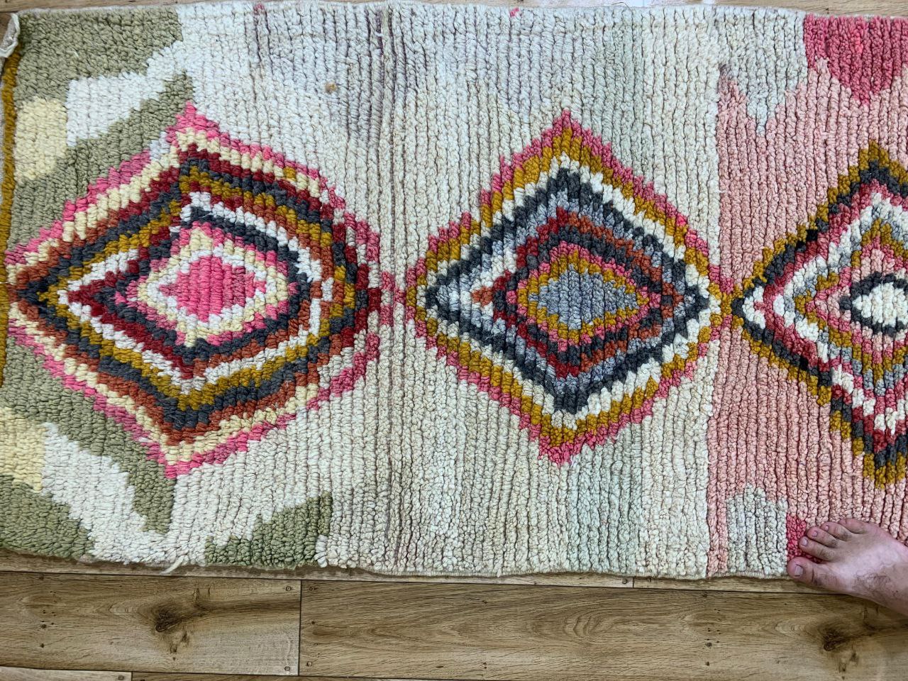 Visually striking geometric runner rug featuring a vertical sequence of bold diamond motifs. The design blends soft blush pinks, cream, sage green, olive, and subtle black accents, creating a warm and inviting look that stands out without overpowering a space.