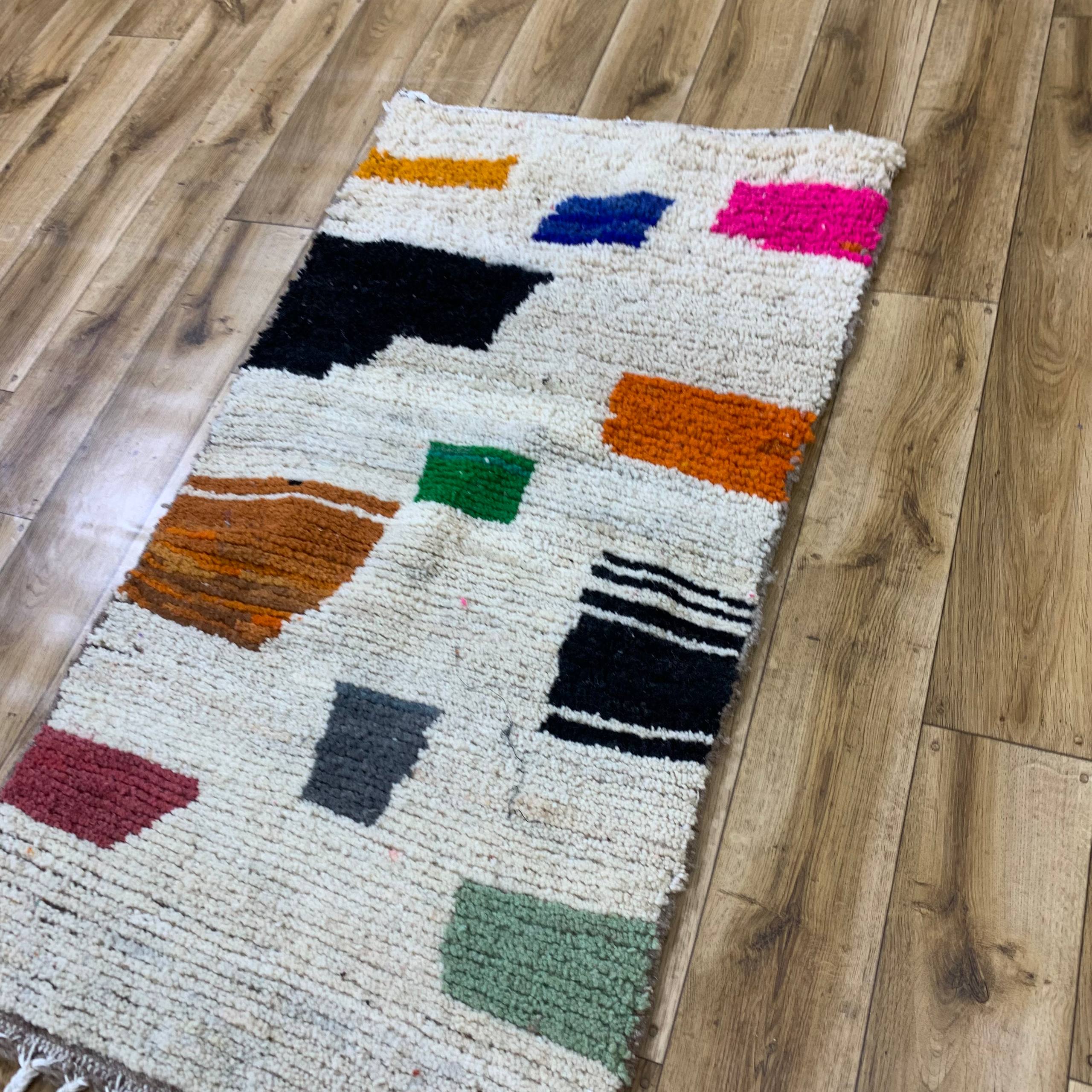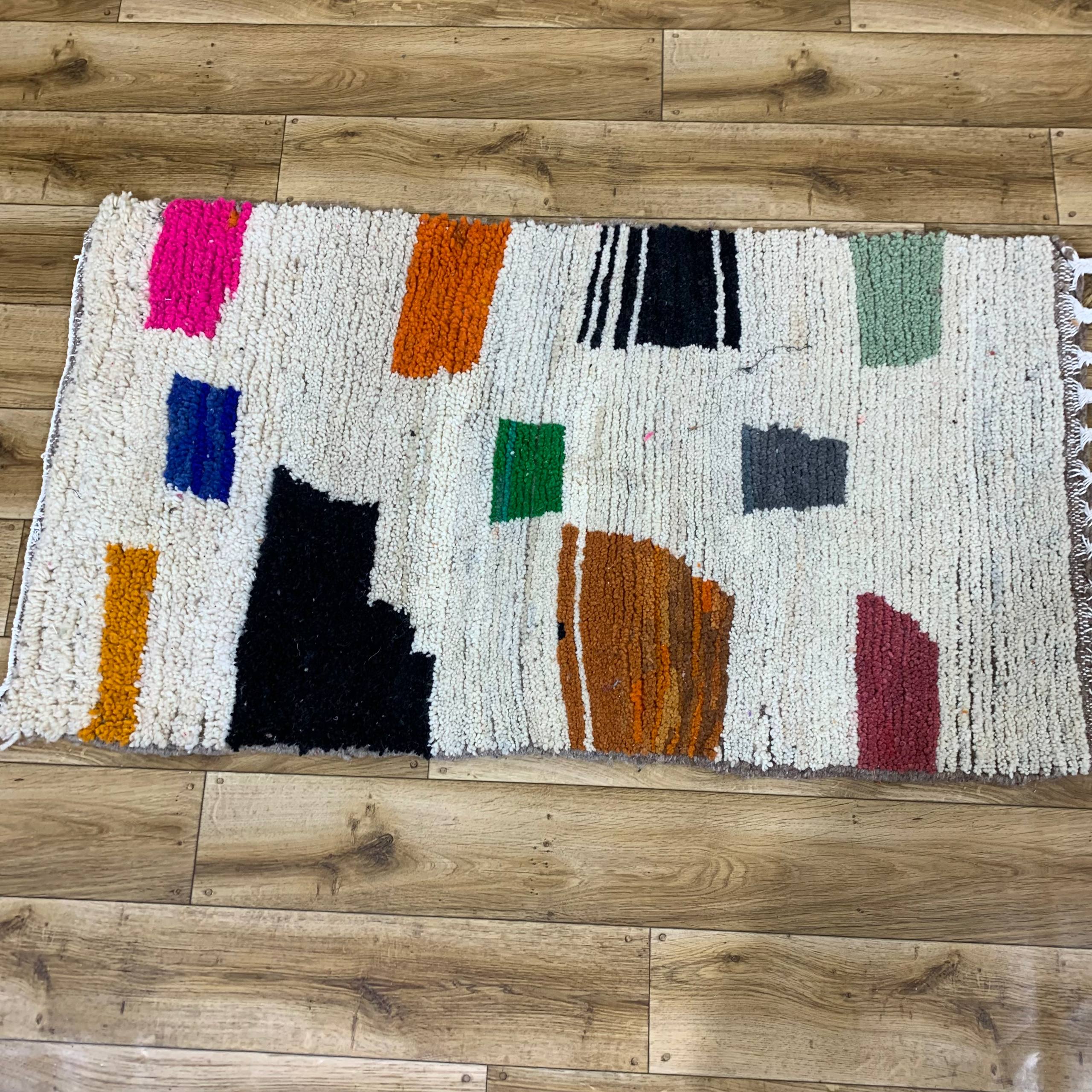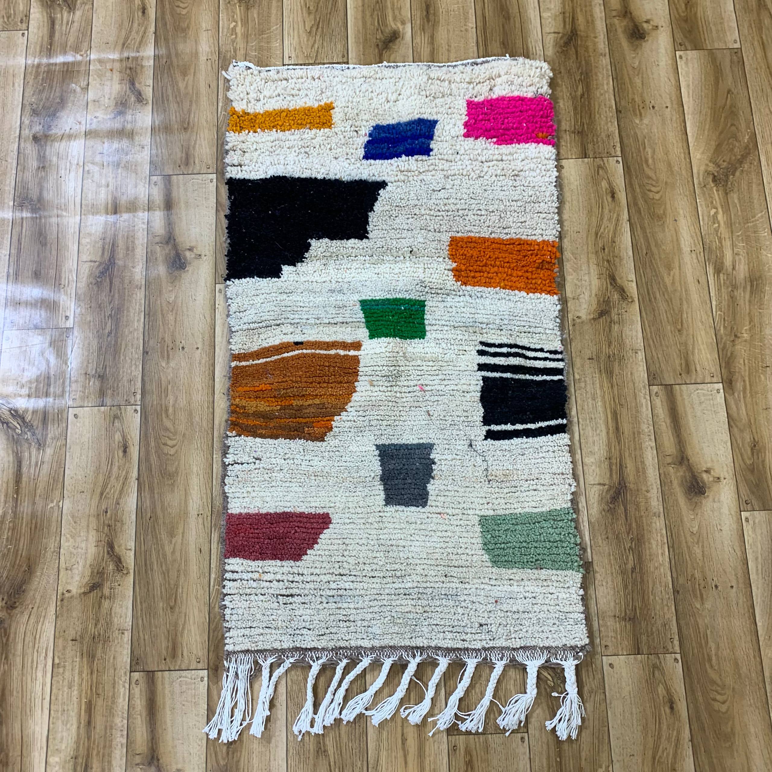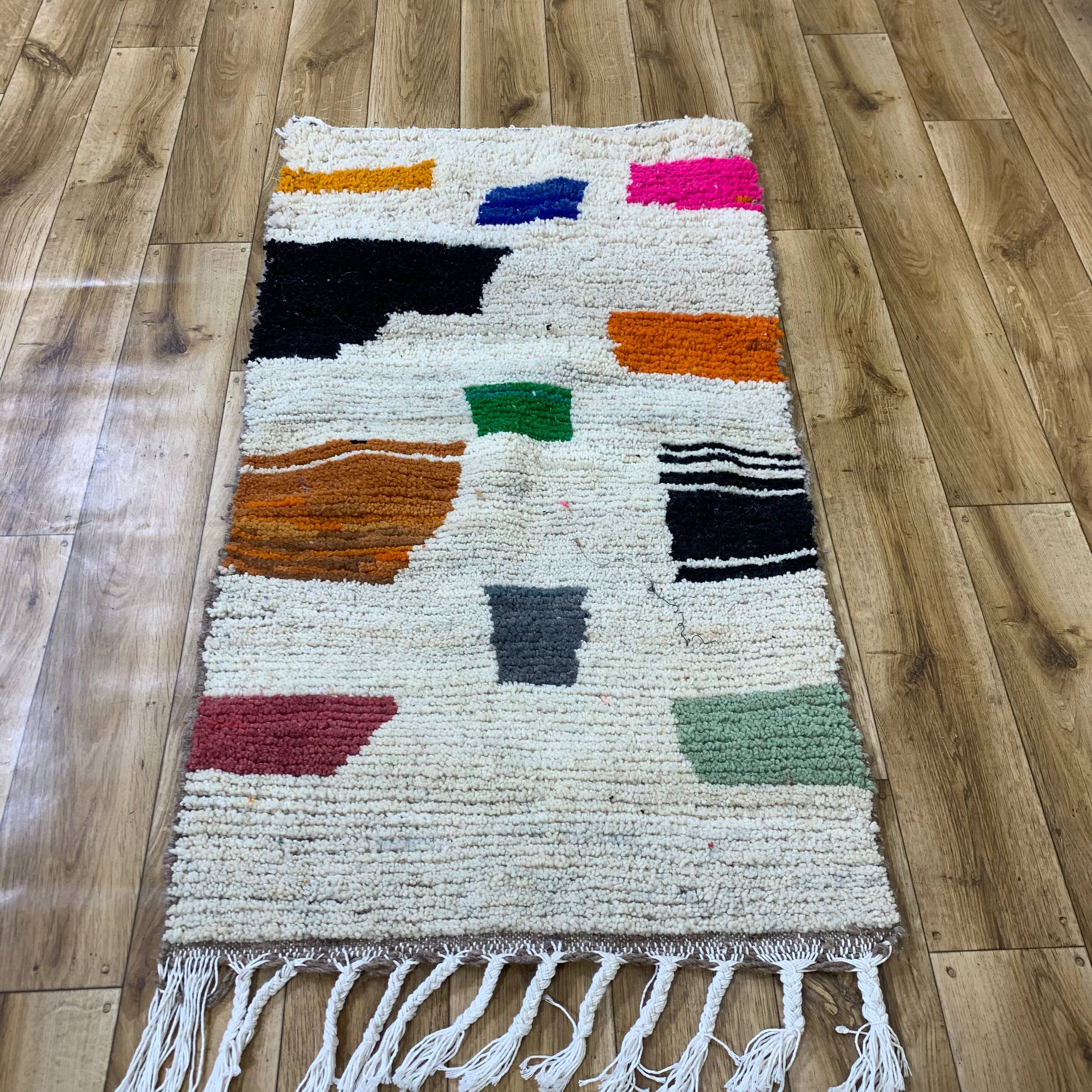 Visually rich and tactile, this rug features a thick, handwoven texture with a soft, natural look. The surface shows a creamy off‑white base accented by bold geometric color blocks in earthy orange, deep green, and black, creating a modern yet artisanal feel.