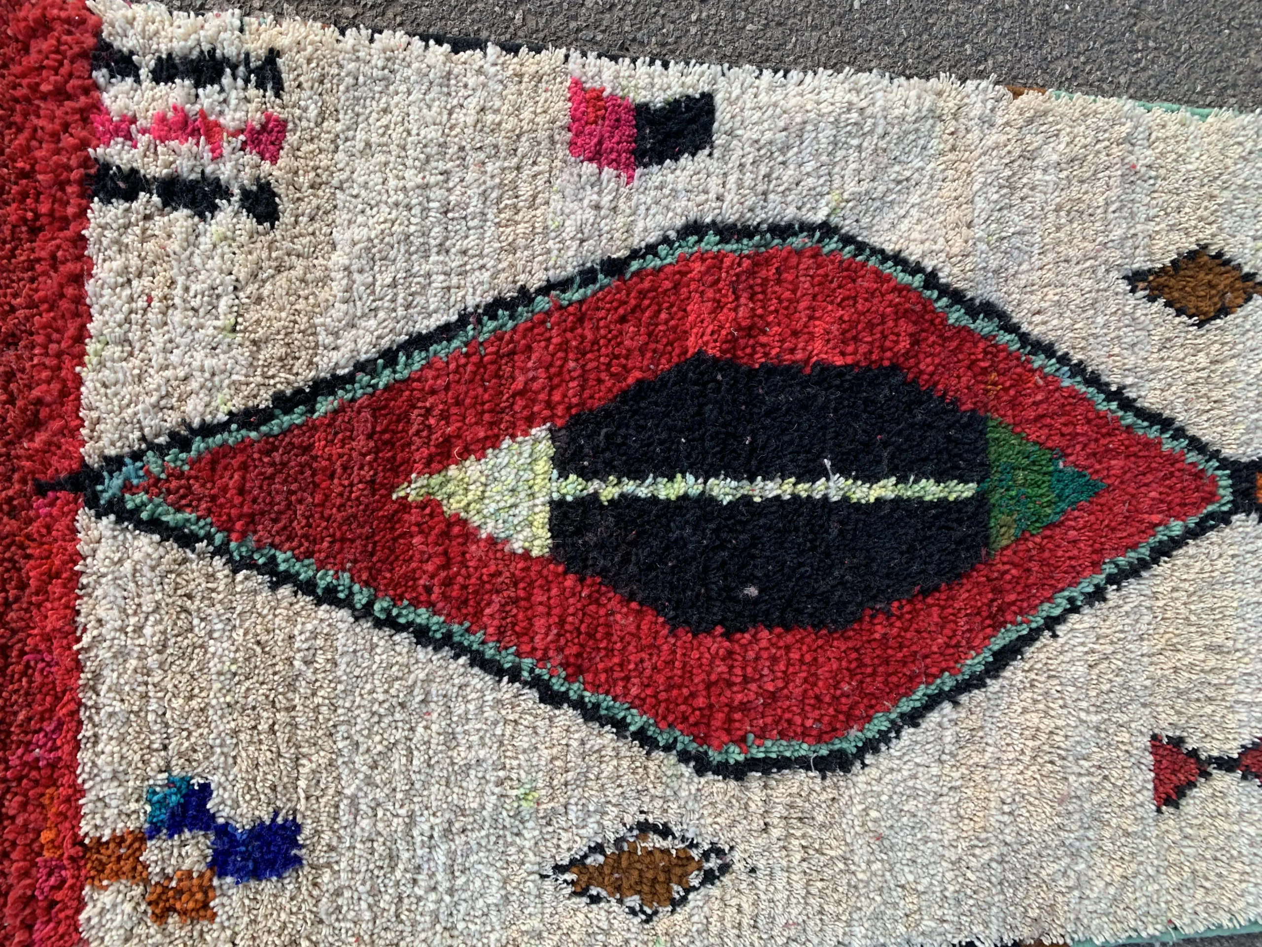 Handwoven Wool Runner Rug featuring a striking vertical composition of bold geometric diamond motifs. The rug displays a warm natural cream background accented with vivid red, deep black, teal, green, orange, and small multicolor details.