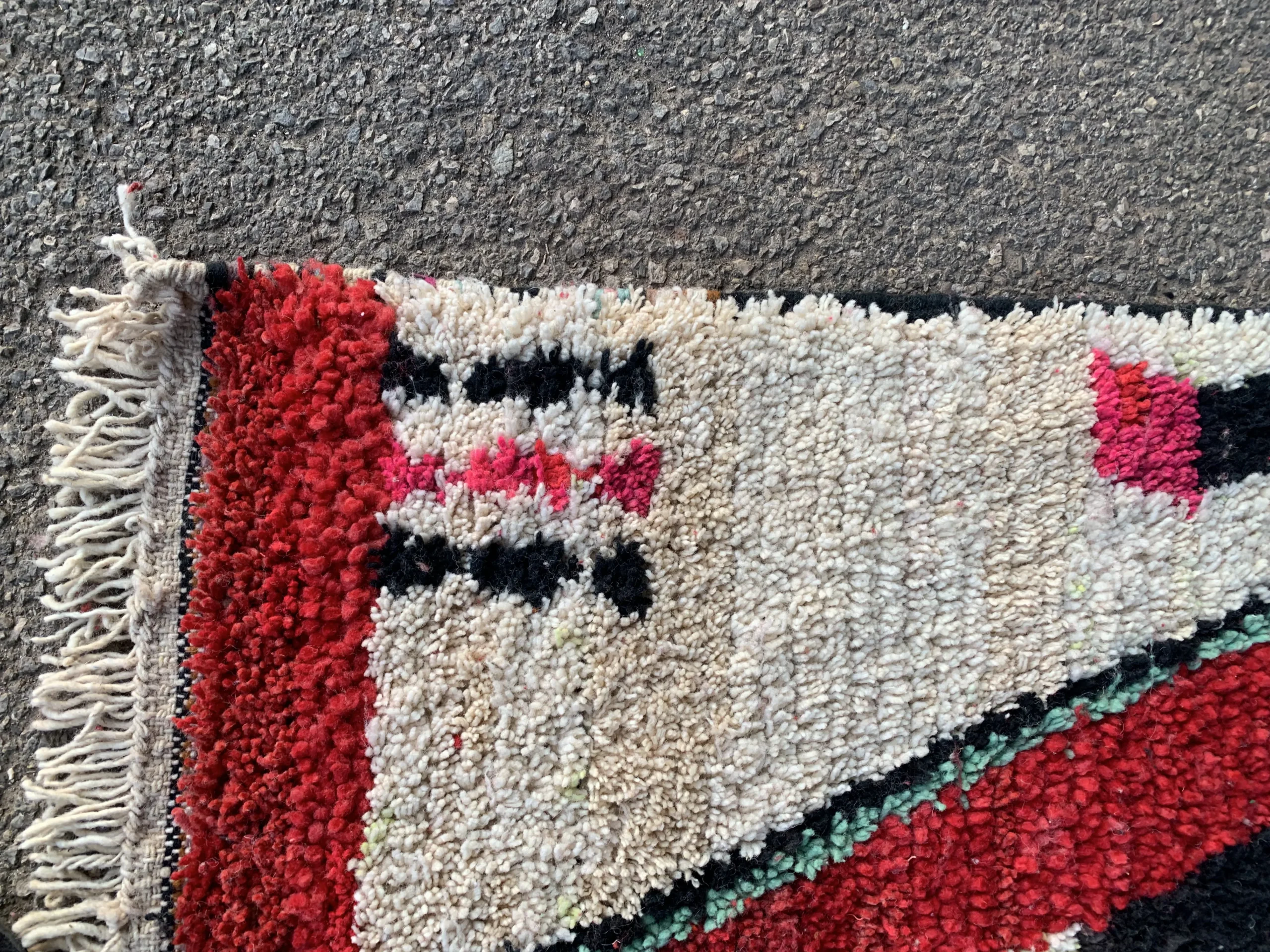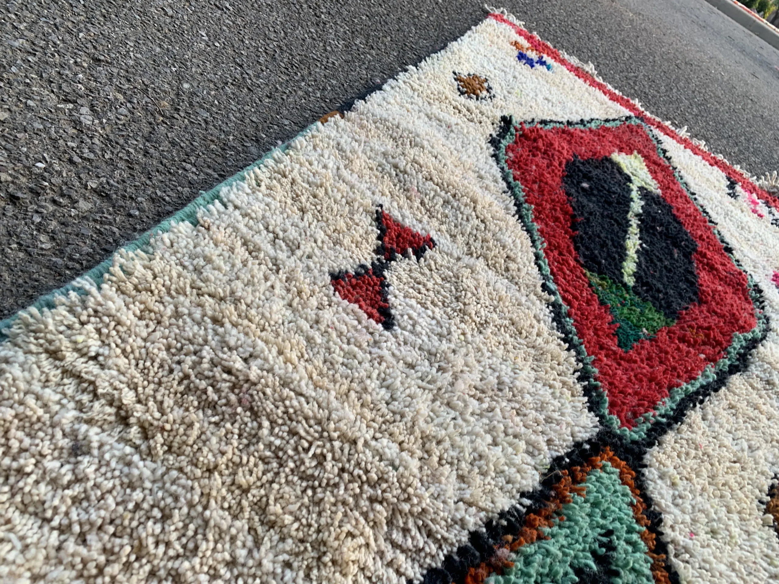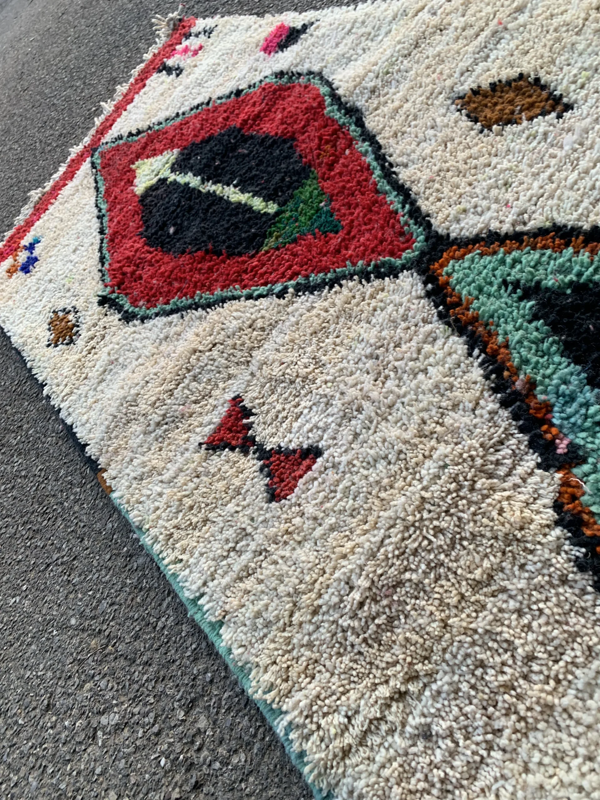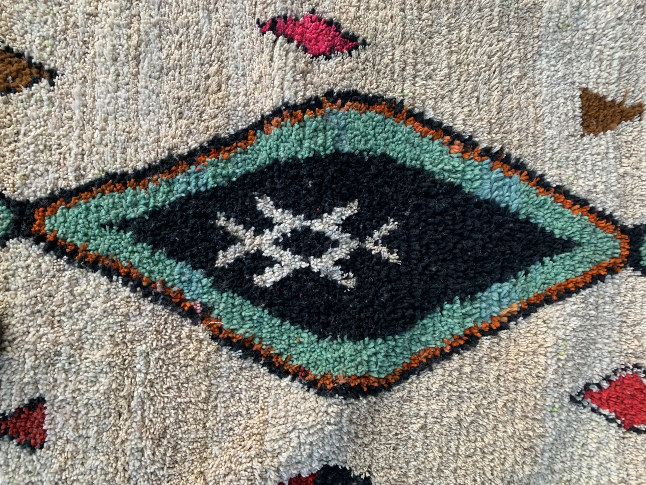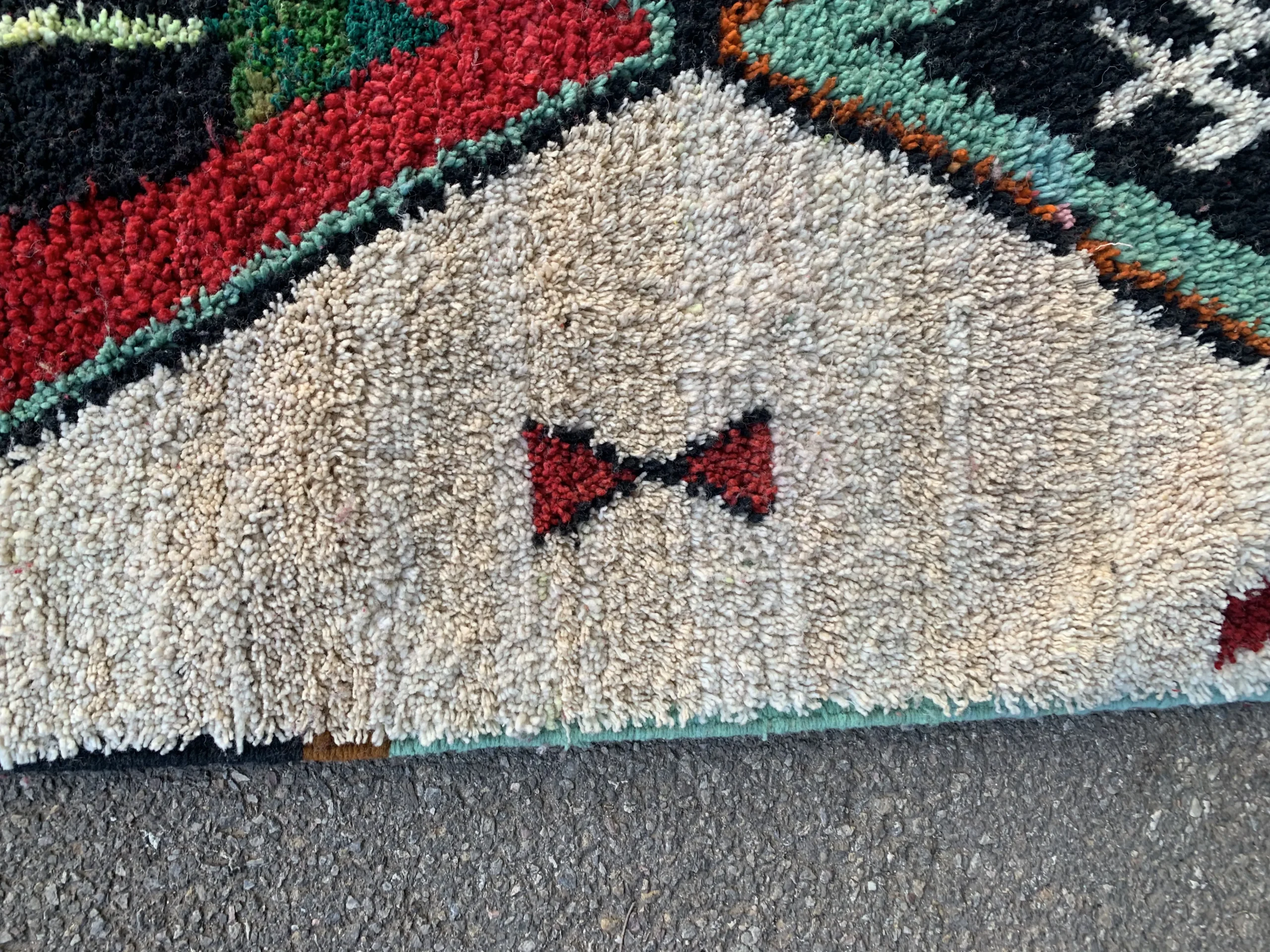 This rug works beautifully as a functional floor covering or as a decorative accent piece for interiors that embrace artisanal, bohemian, or rustic styles.