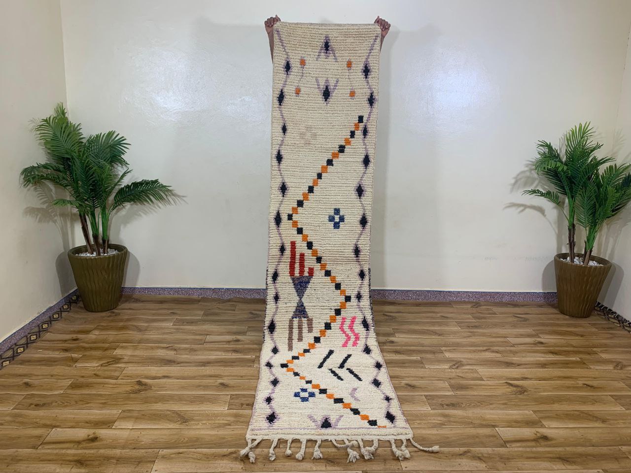 A narrow ivory runner rug with a textured weave, colorful geometric zigzag design, and tassel fringe, perfect for hallways and entryways.