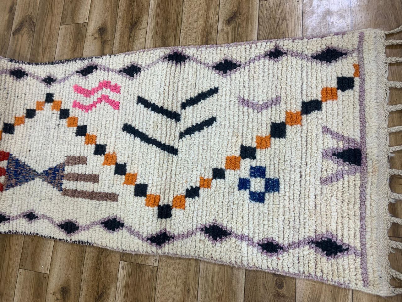 This long runner rug features a soft ivory base accented with bold geometric motifs. The design showcases a striking diagonal zigzag line in orange and dark tones, surrounded by small diamond and abstract symbols in navy, black, pink, and muted blue.