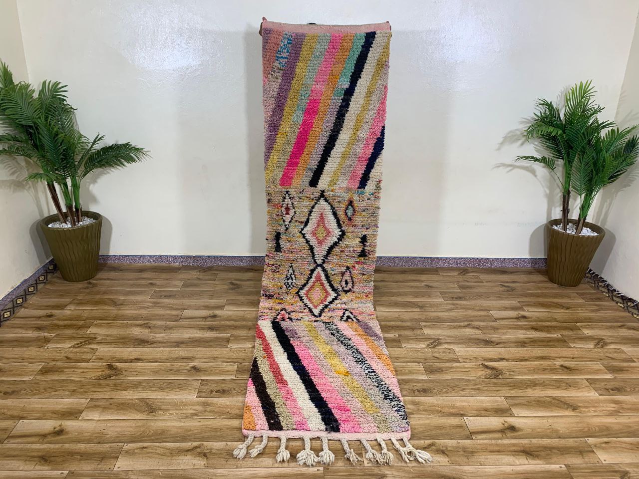This eye-catching rug runner features a bold geometric pattern with a soft, shaggy texture. Inspired by bohemian and tribal designs, it showcases repeating diamond motifs outlined in black, filled with warm pastel tones including pink, yellow, cream, and subtle multicolor accents.