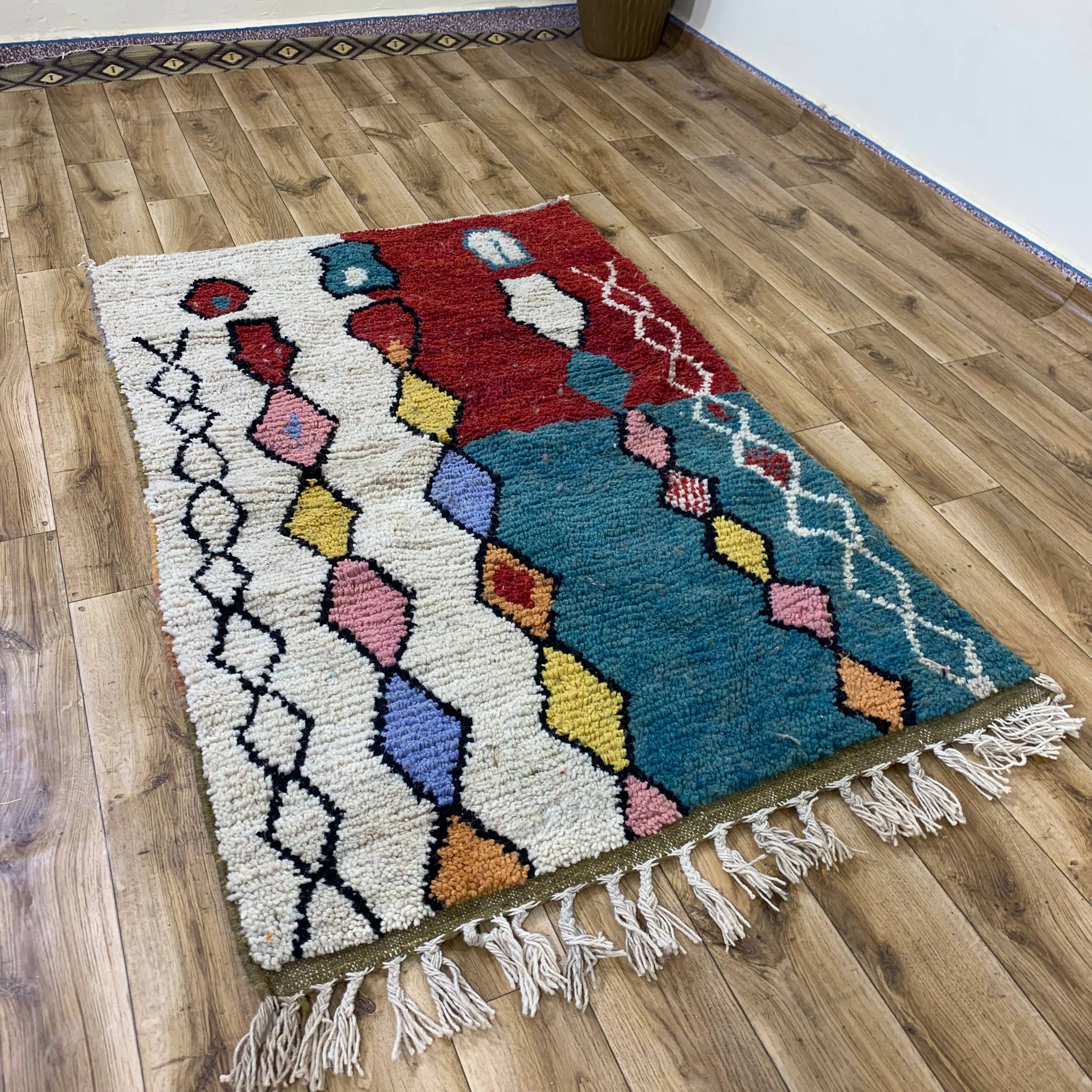 The rug showcases a dense, looped pile texture that adds depth and tactile appeal, making it both decorative and comfortable underfoot. A visible fringed edge enhances its artisanal look, giving the rug a handcrafted, bohemian feel that works beautifully in eclectic, modern, or creative interiors.