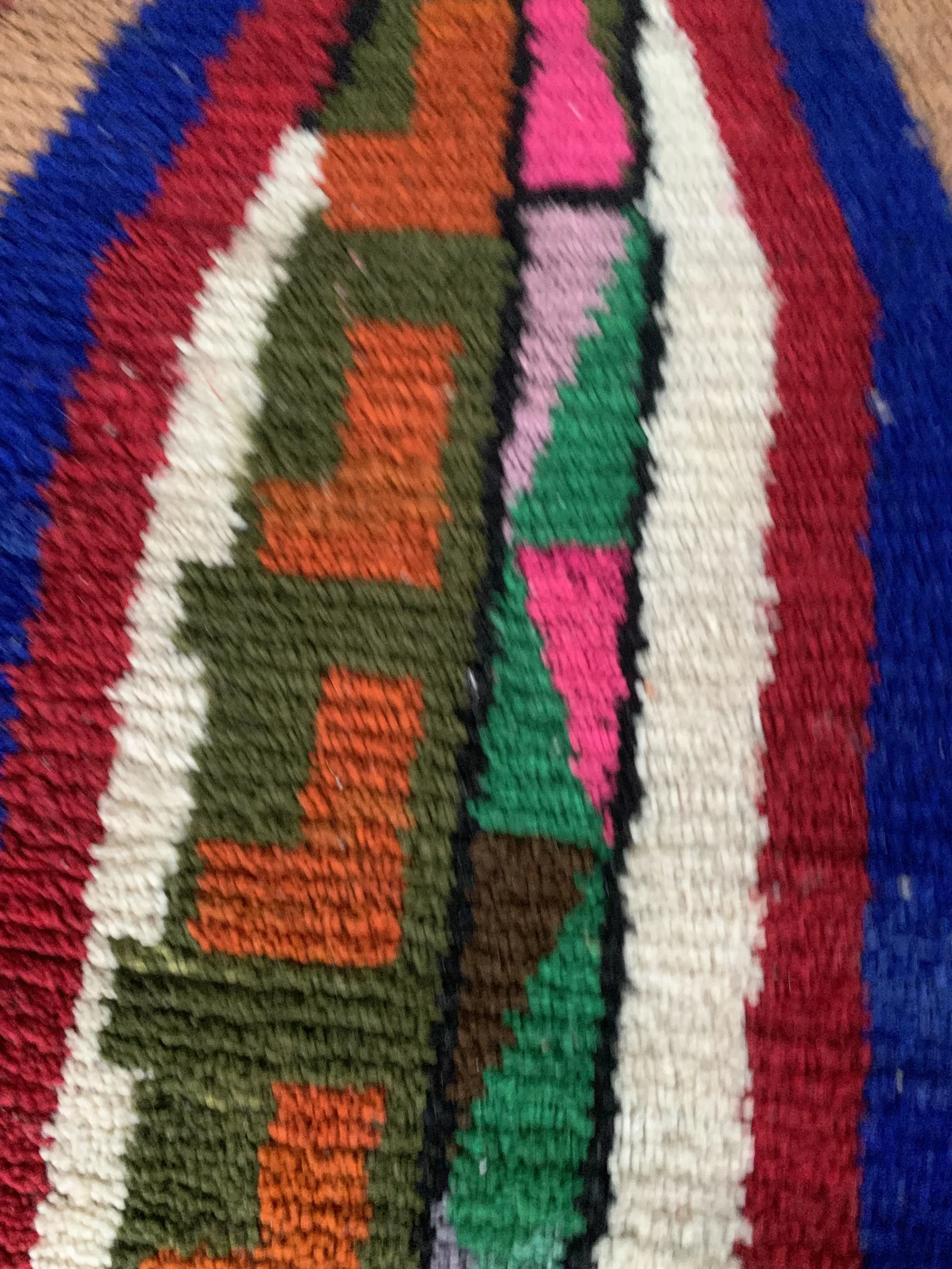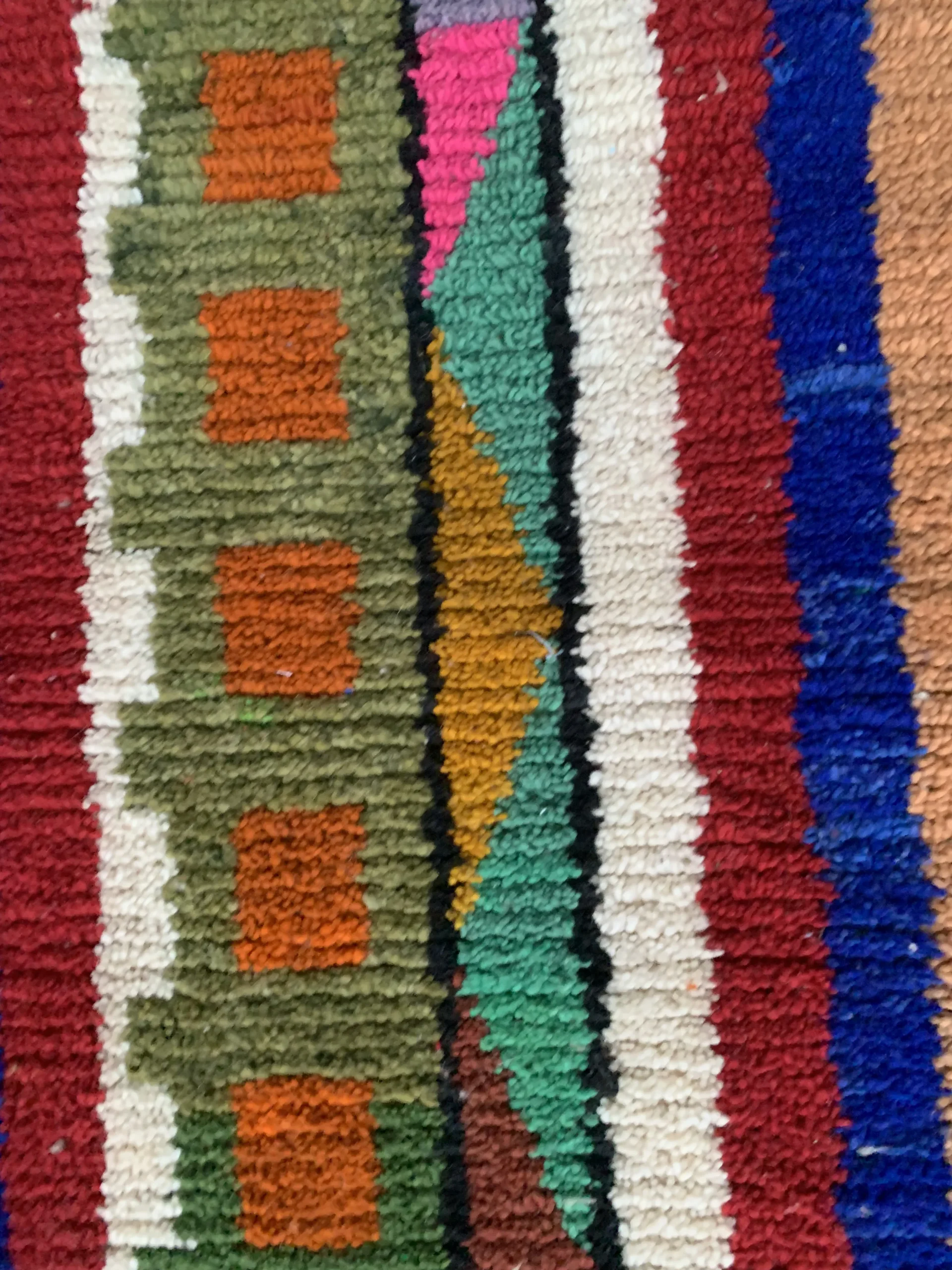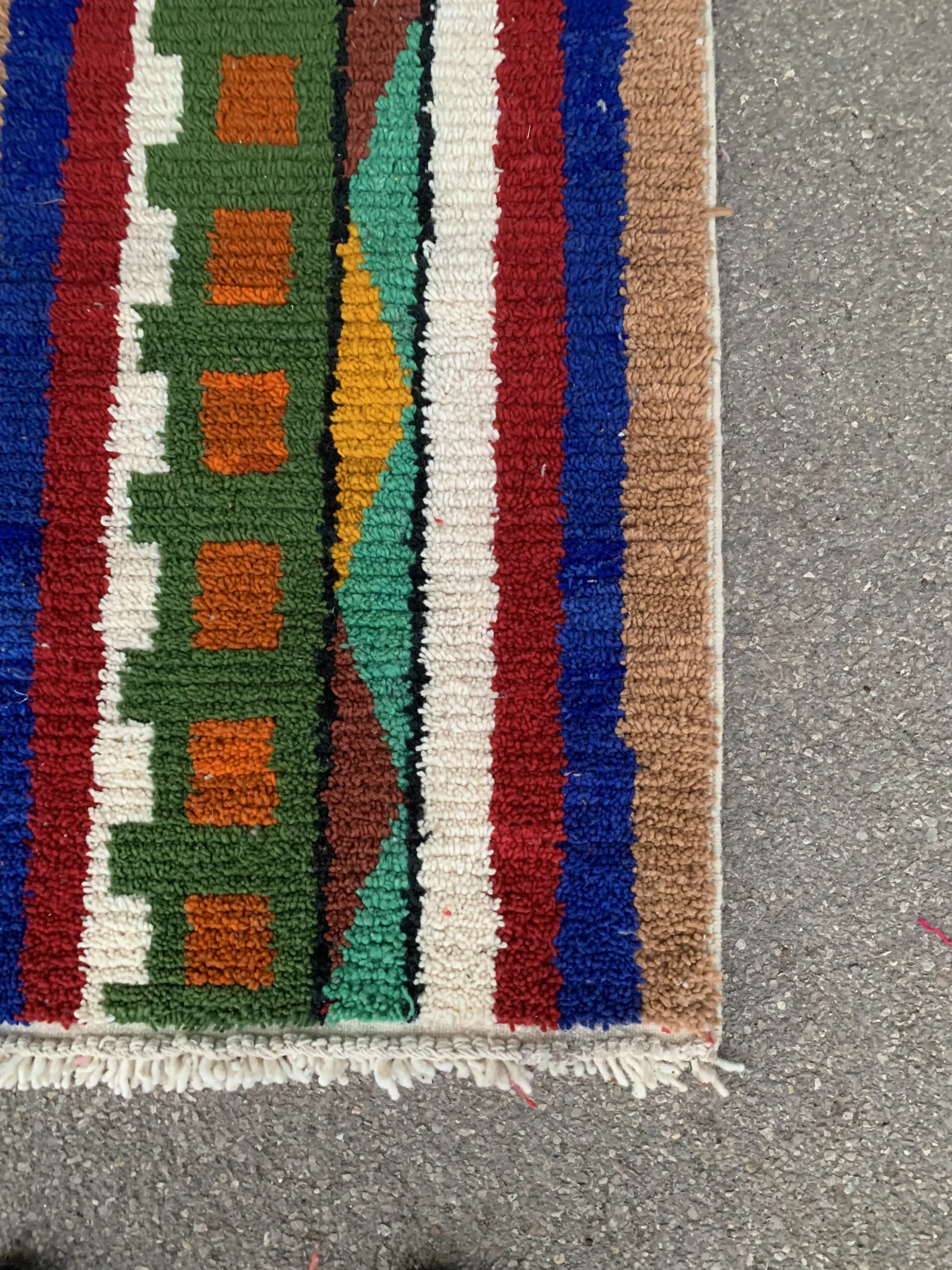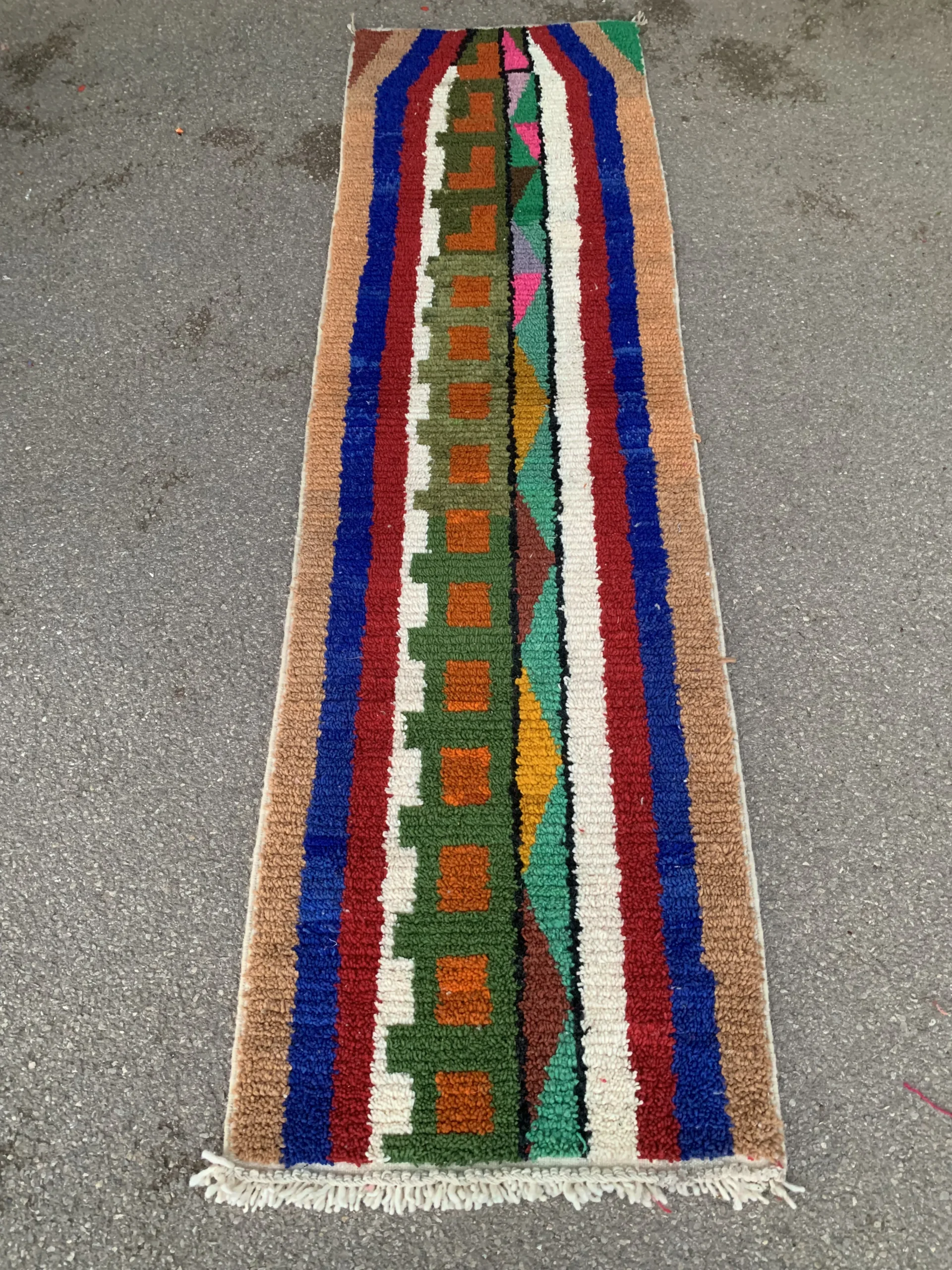 Textured tribal runner rug with bold geometric patterns, vibrant multicolor stripes, and traditional fringe detailing—perfect for hallways and narrow spaces.