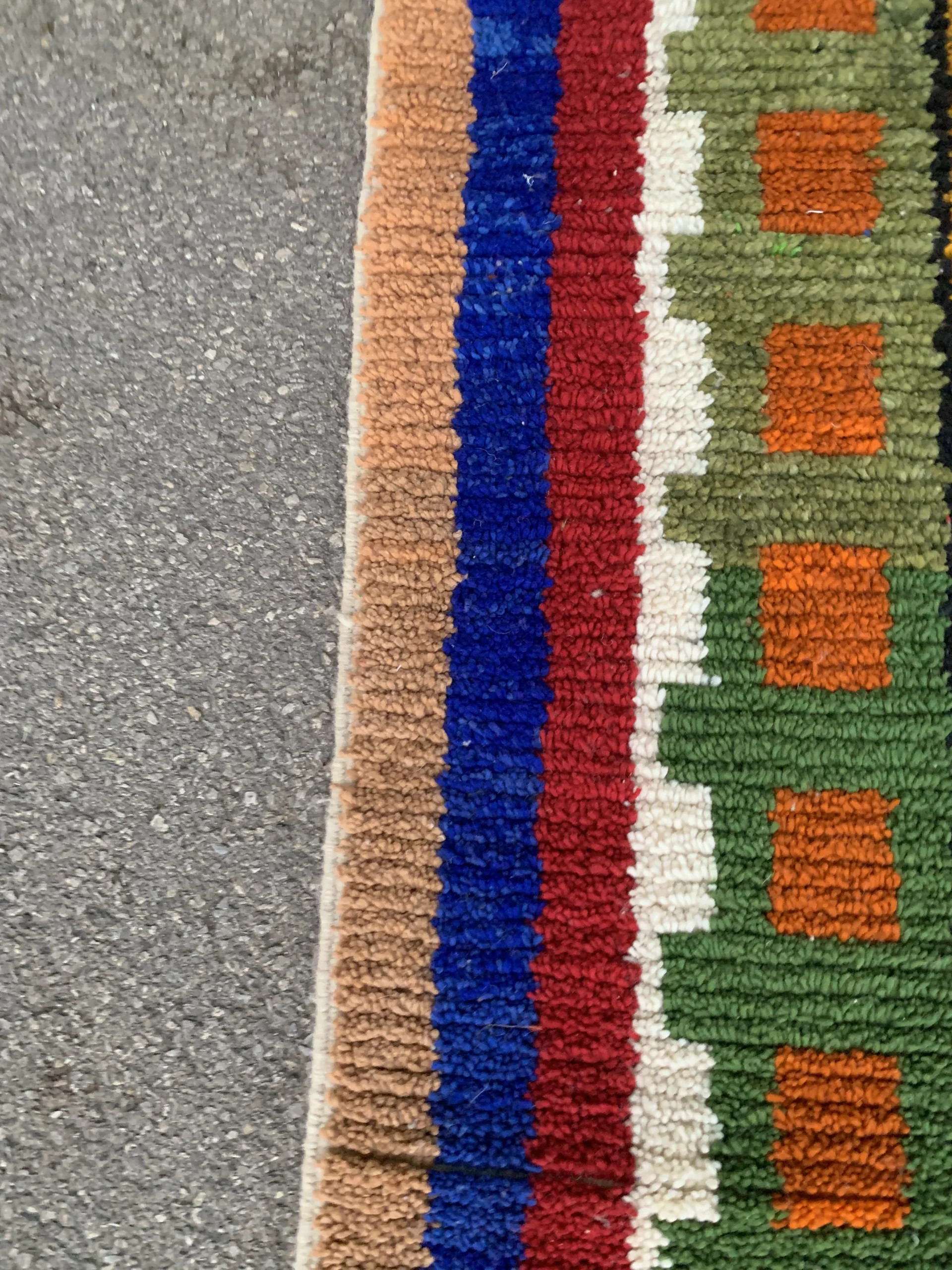 The rug has a dense, looped pile texture that gives it a soft yet structured feel underfoot. A short fringe finish along the edge adds a traditional handcrafted look, making it ideal for hallways, entryways, or narrow living spaces where a statement piece is desired.