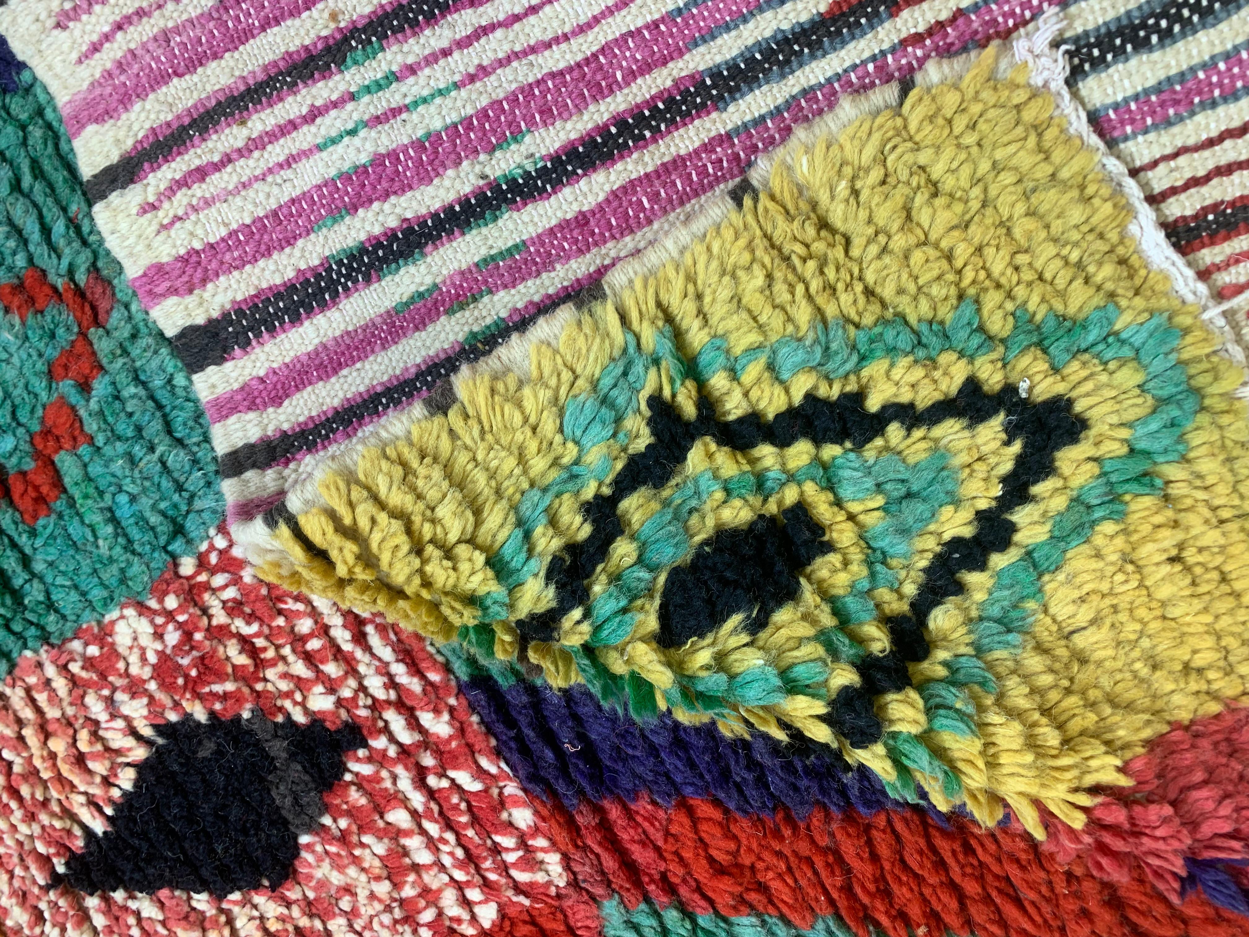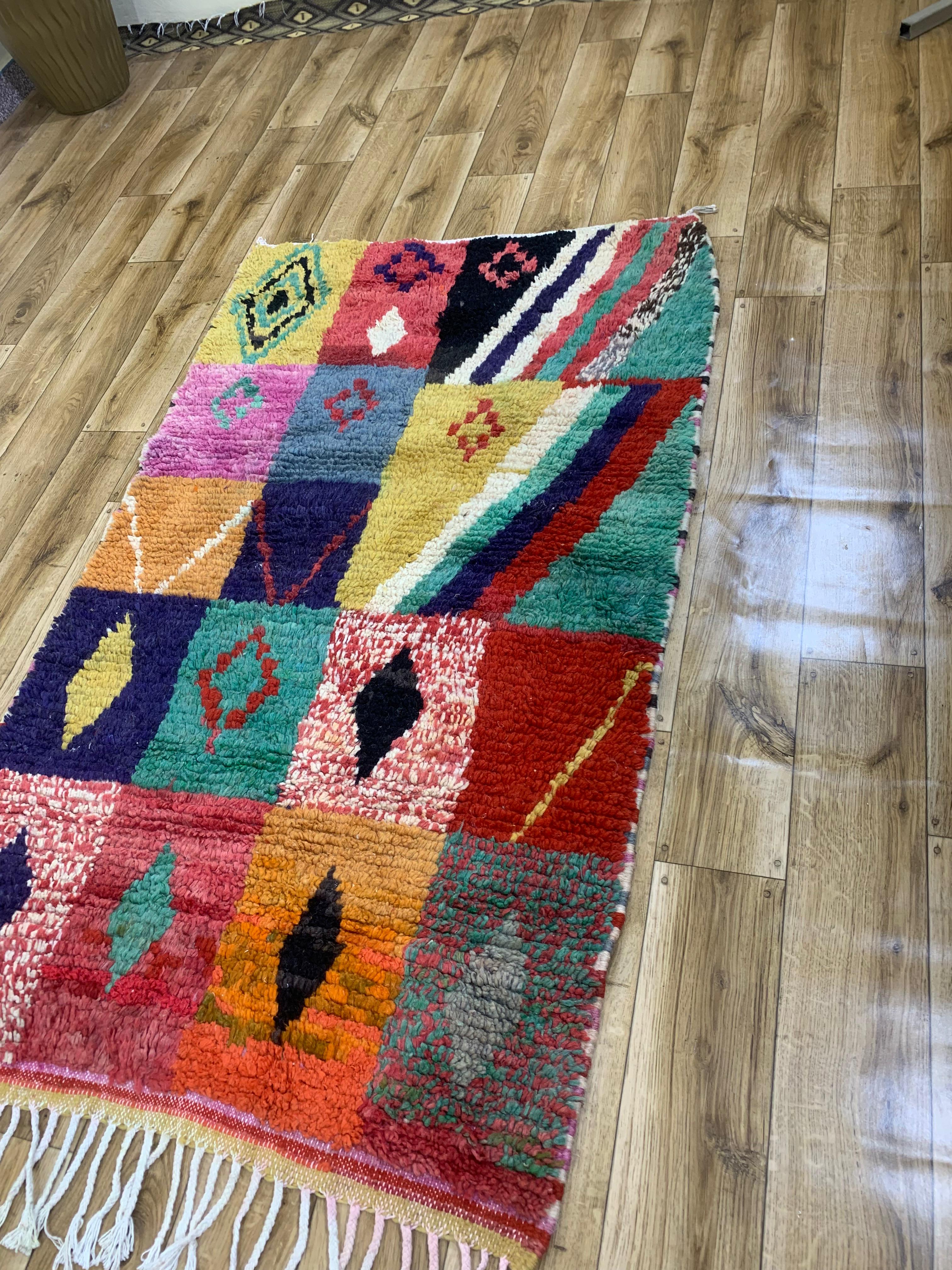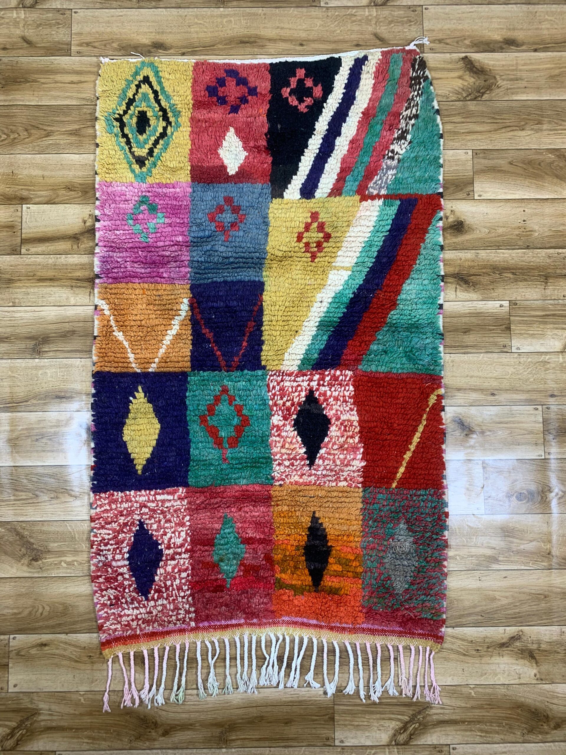 The design combines bold diamonds, stripes, and abstract shapes in rich tones of red, blue, green, yellow, pink, black, and cream. Finished with soft knotted fringe along one end, this rug has a relaxed, artisanal look that works well in bohemian, eclectic, or modern interiors.