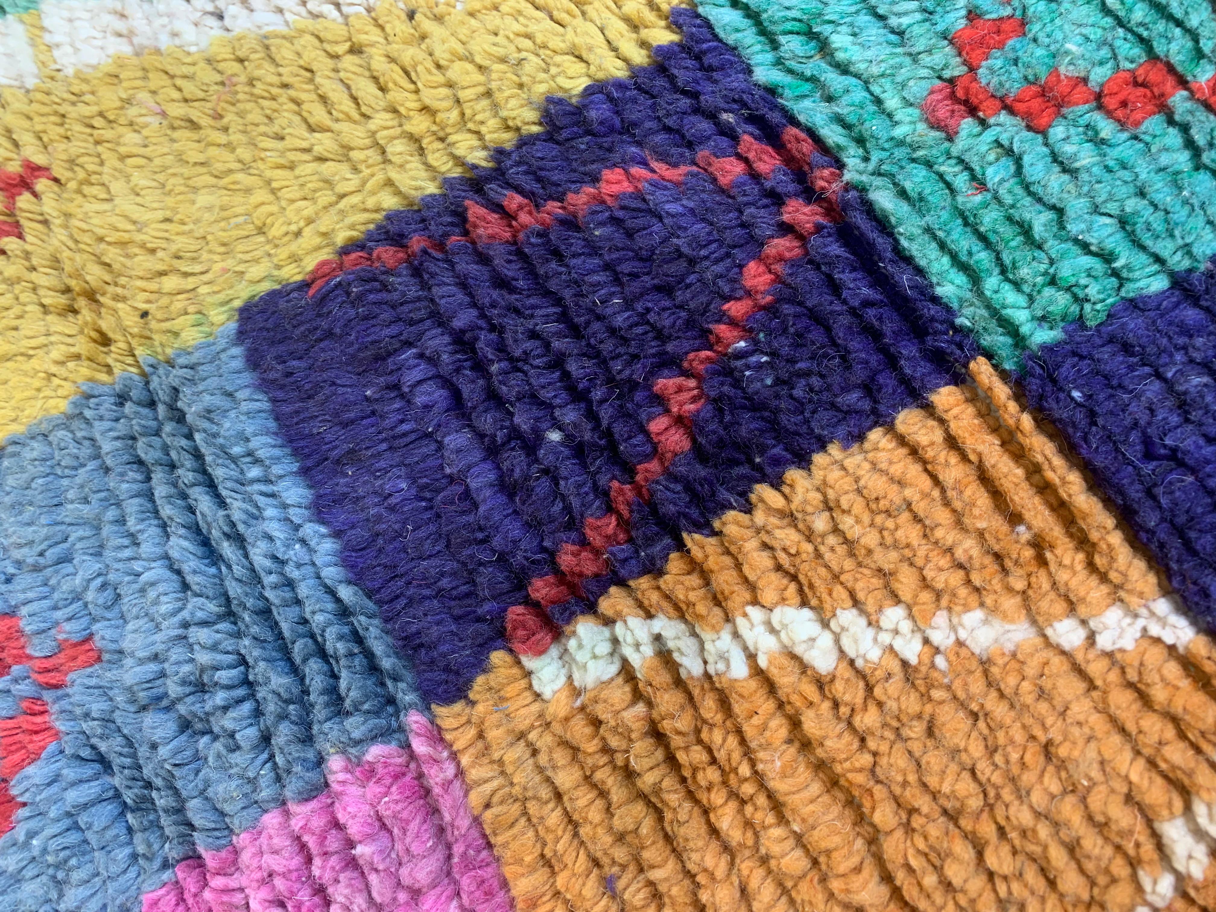 Handcrafted patchwork rug featuring a vibrant grid of multicolored squares, each with its own geometric motif or striped pattern. The rug has a thick, shaggy pile that adds texture and warmth, making it a cozy and eye‑catching accent for any space.