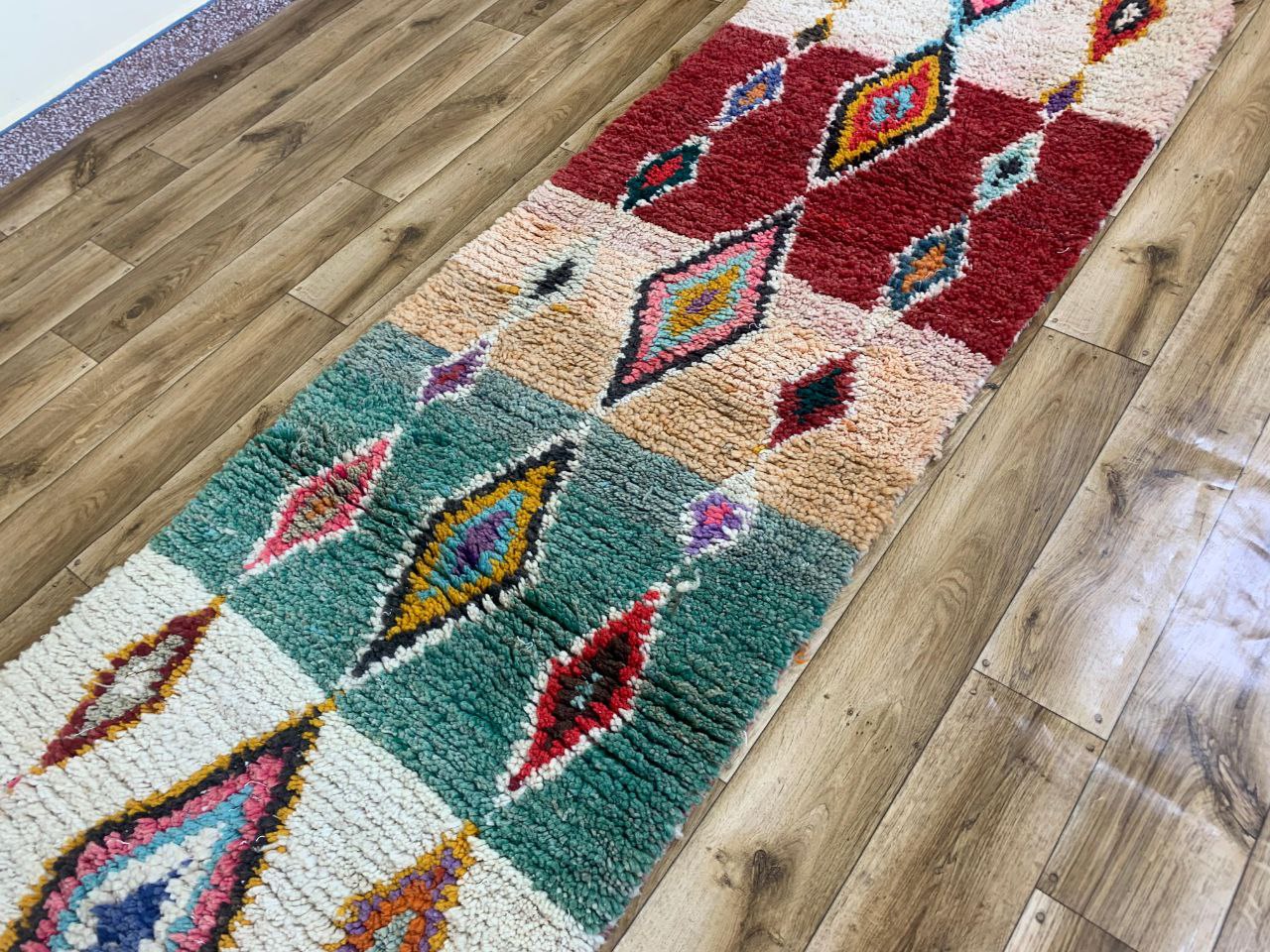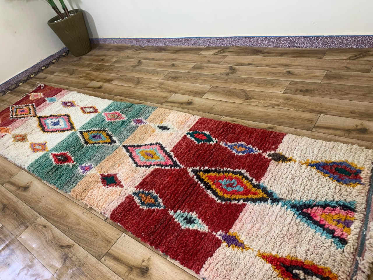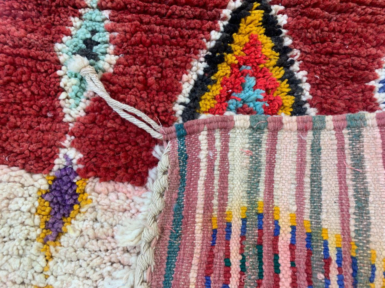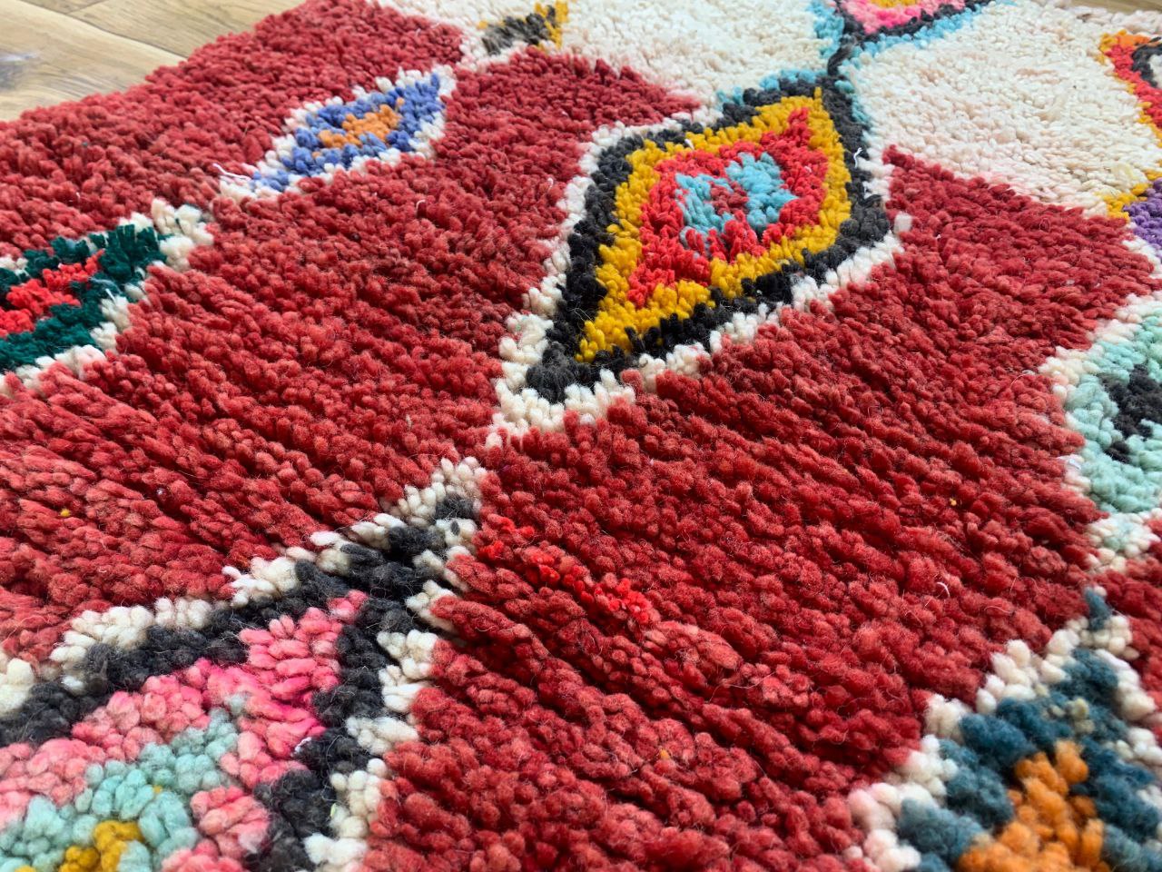 This visually rich rug features a vibrant mix of colors and textures, creating a lively and artistic floor accent. The design combines raised, looped yarn sections with flatter woven areas, giving the surface a tactile, handcrafted feel.