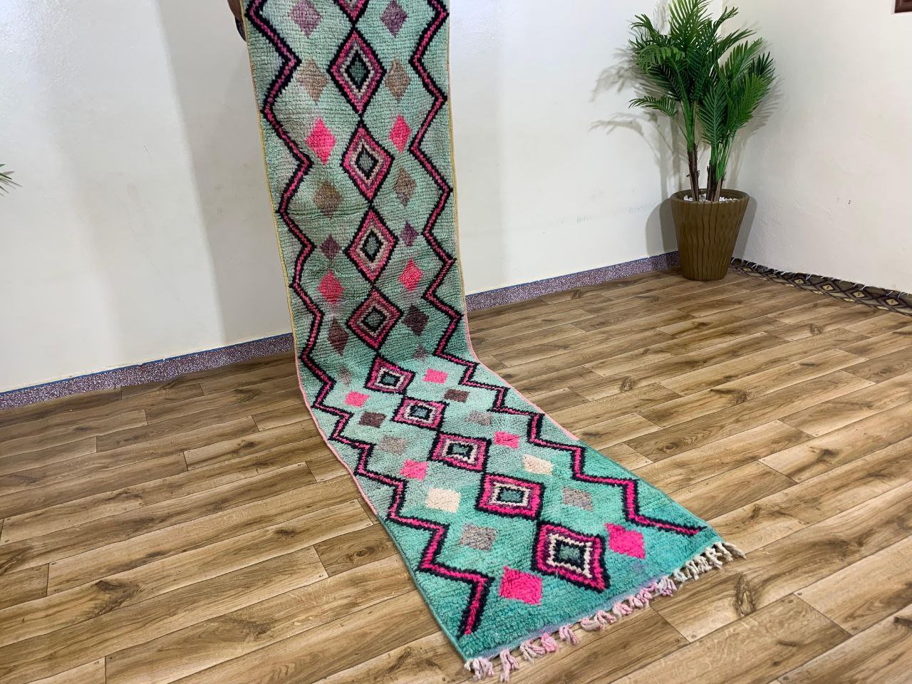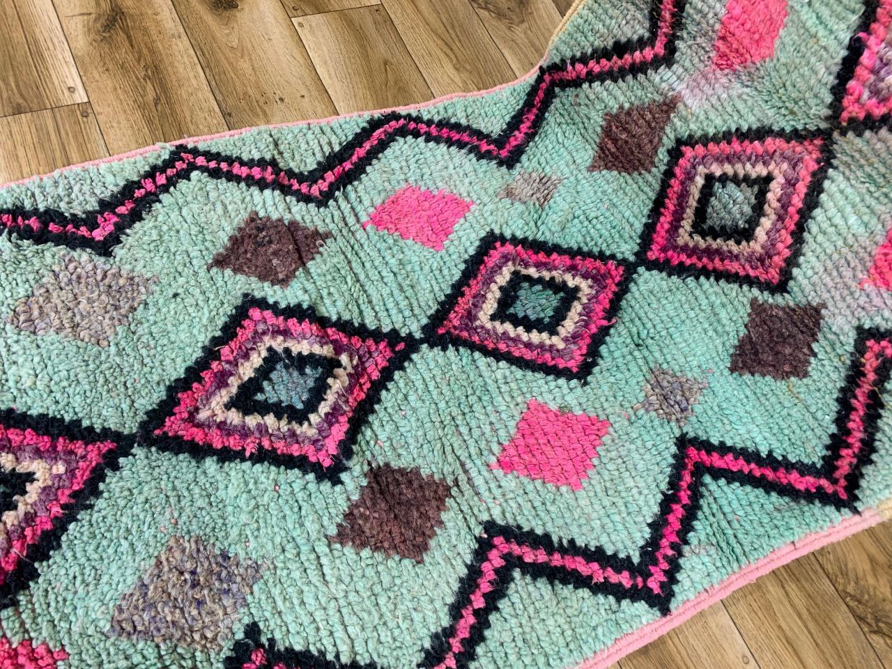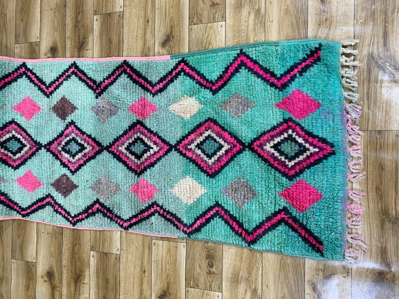 Colorful geometric runner rug with a turquoise base, bold pink diamond motifs, and zigzag accents. A textured, handwoven-style rug finished with fringed ends, perfect for hallways or narrow spaces.