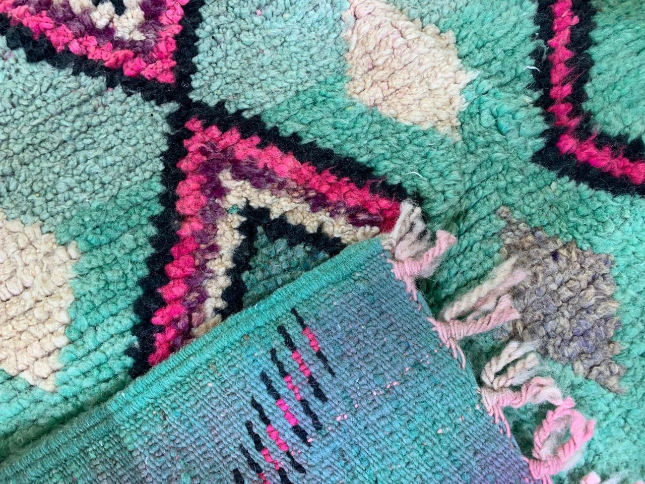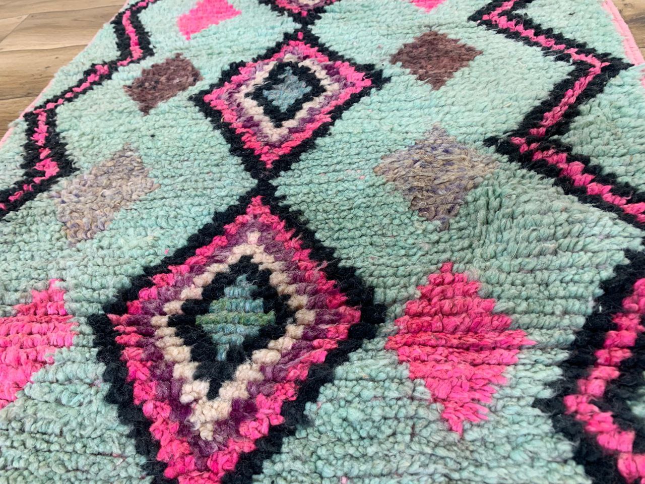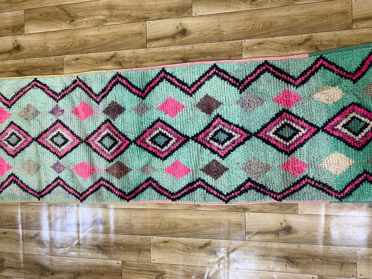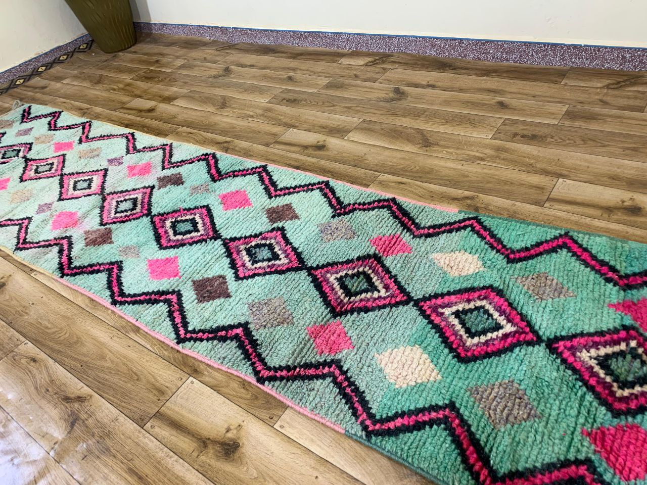 Colorful geometric runner rug with a turquoise base, bold pink diamond motifs, and zigzag accents. A textured, handwoven-style rug finished with fringed ends, perfect for hallways or narrow spaces.