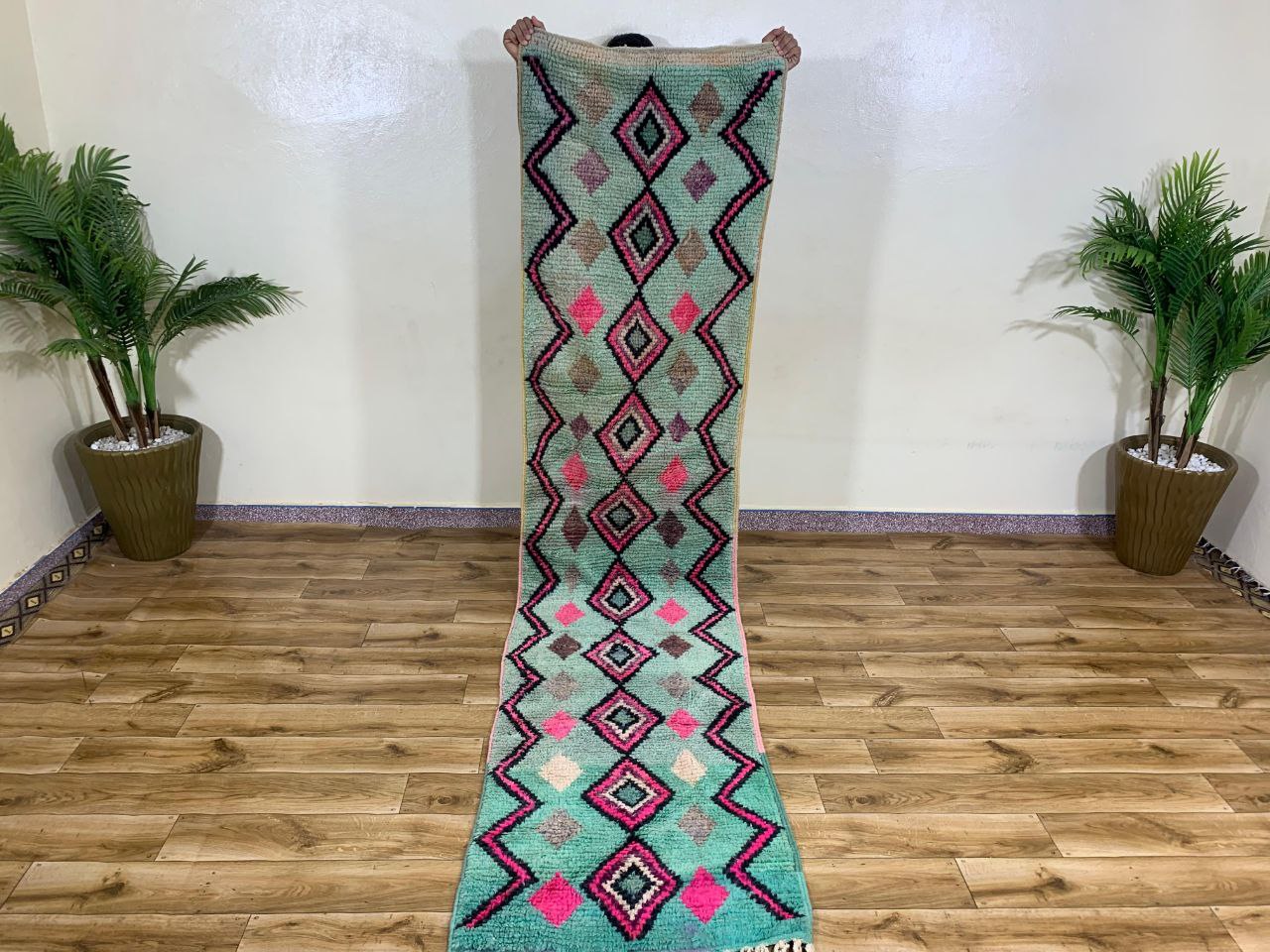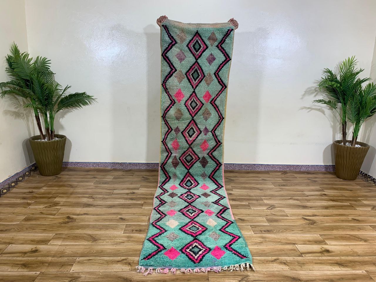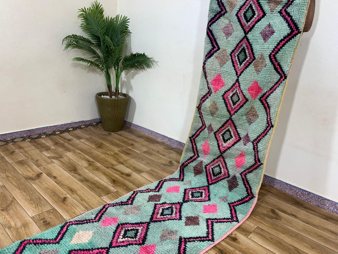 This long, narrow runner rug features a rich turquoise base accented with bold diamond and zigzag motifs in pink, black, beige, and earthy brown tones. The repeating geometric pattern creates a striking visual flow, making it ideal for hallways, entryways, or alongside a bed.